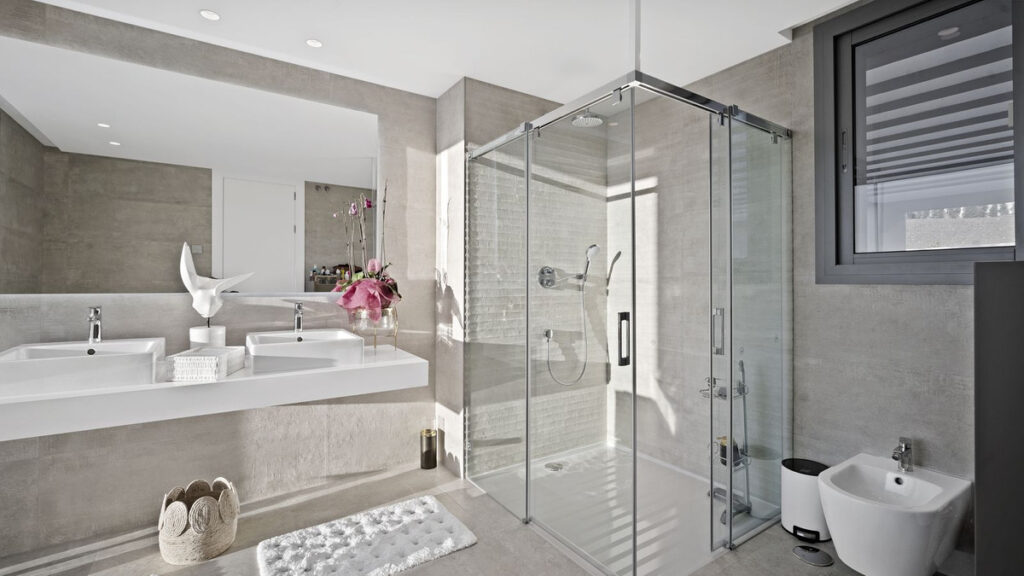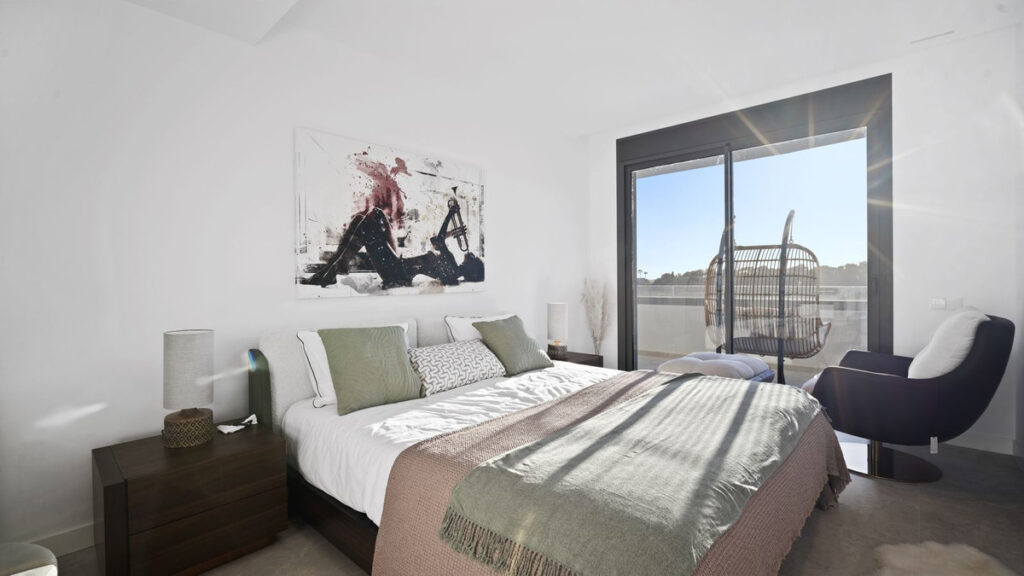 You enter the Villa on the 1st floor where you find 3 bedrooms each facing South/west with stunning views to Golf, Sea and mountains. The Master bedroom is a great size with wonderful en-suite bathroom with Walk-in shower modern bathtub, double sink, toilet and bidet. Ample fitted wardrobes throughout the property and underfloor heating individually controlled.