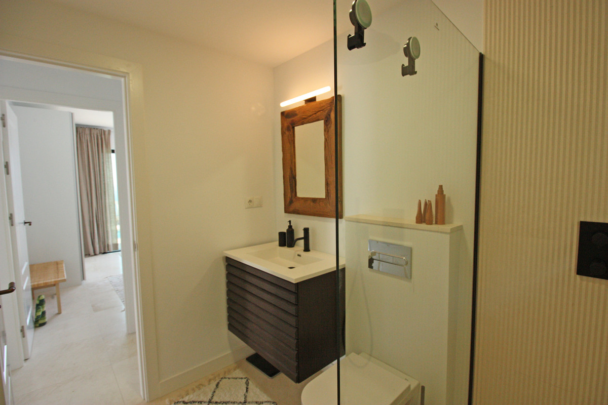 The main house has 3 bedrooms, 2 bathrooms and a big kitchen facing the front terrace, all in one level and connected to the pool area. Under the terrace there is an annex bedroom of aprox 25m2 with its own small chill out terrace, and en suite bathroom.