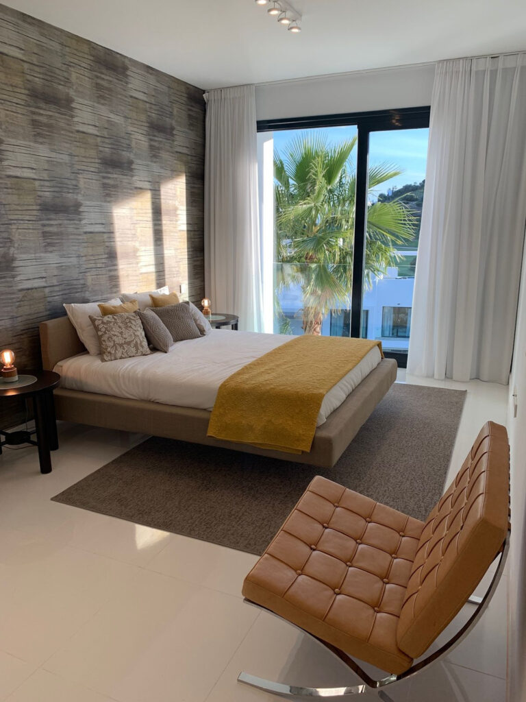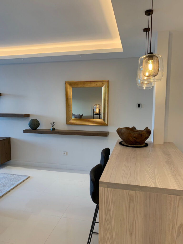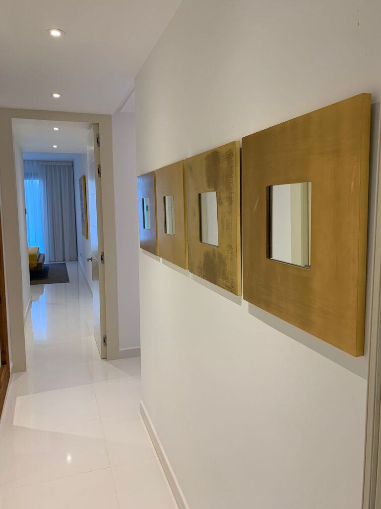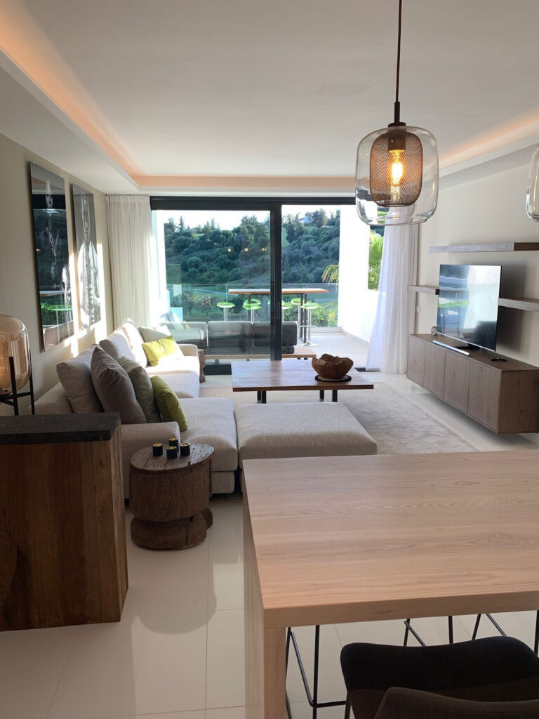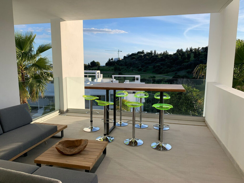 5* Luxury and contemporary middle floor apartment. The avant-garde architecture is designed by the famous architects Villarroel – Torrico @ Puente Romano Marbella. The setting is unique and just in front of Atalaya Golf ( 36 holes ) with unobstructed panoramic south orientated views, overlooking the golf courses, garden and parties sea view. Atalaya driving range is literally at your doorstep. The quiet and front golf location is unbeatable. Situated at the end of a cull the sack ( Atalaya Golf course and driving range ) between all-new luxury contemporary villa's in the exclusive secured urbanisation of La Alqueria – Benahavis, 6 minutes to Puerto Banus, 10 minutes to Marbella, 12 minutes to Estepona, 2 minutes to a very nice "Mercadona" supermarket and International School & College.