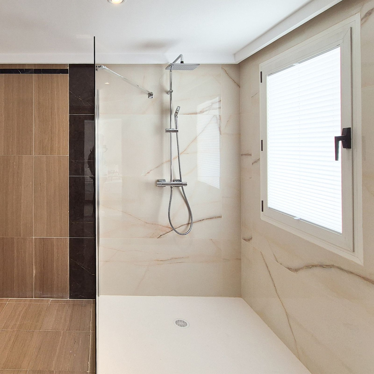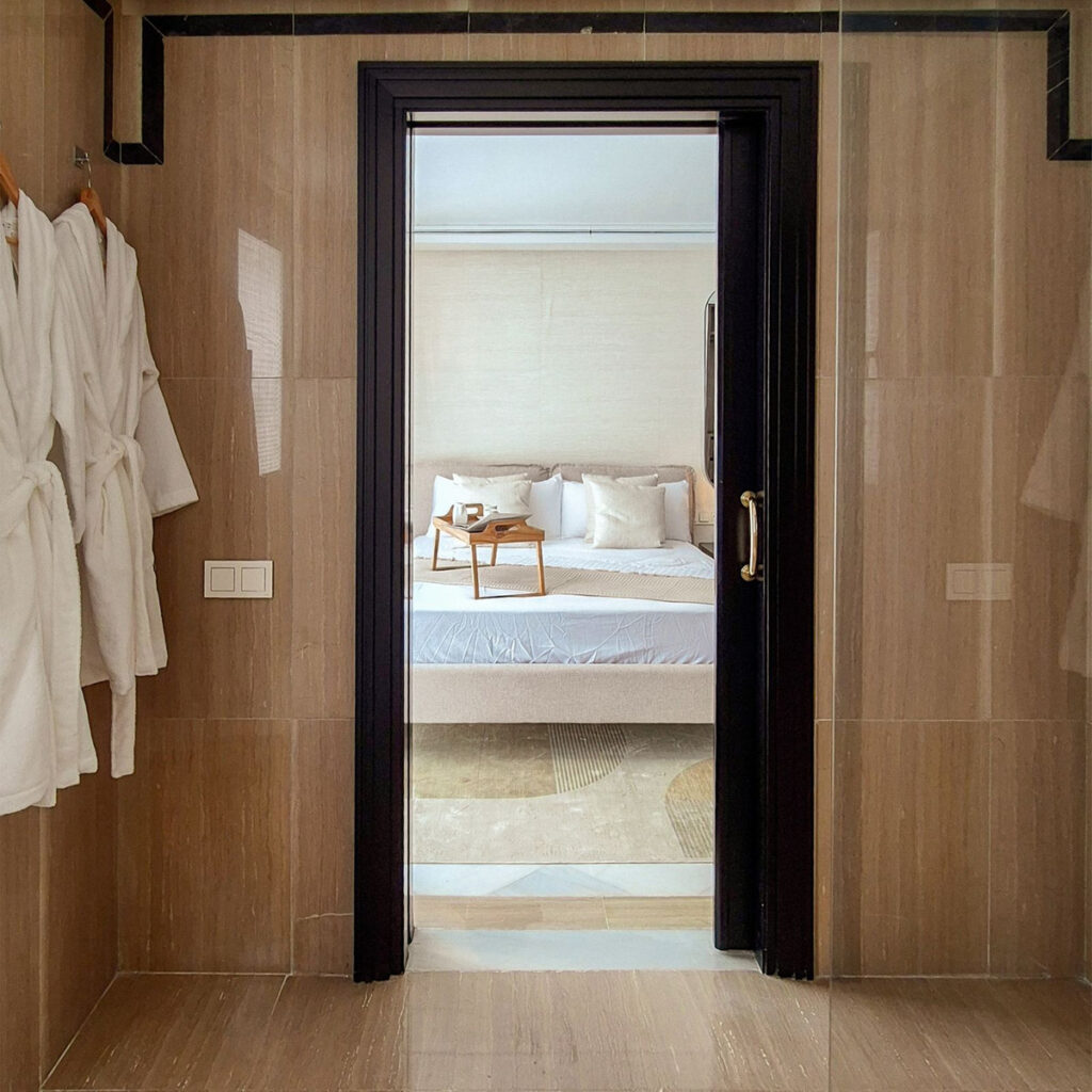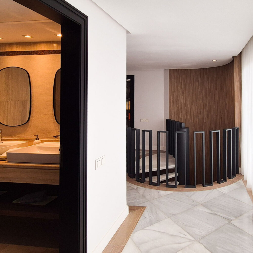 A modern staircase takes us to the second floor, where there is another bedroom, a full bathroom, a wardrobe area, and a large master bedroom with a dressing area and a full bathroom, all with access to the large terrace with views.