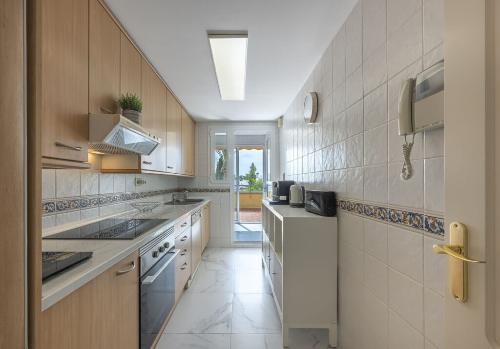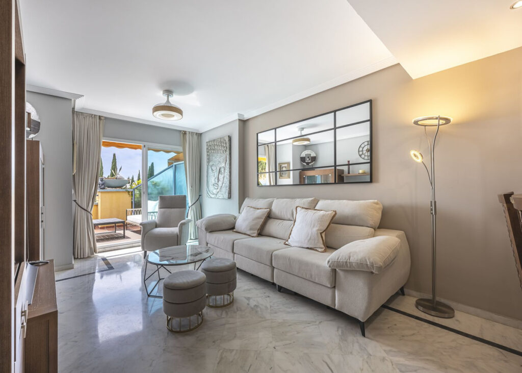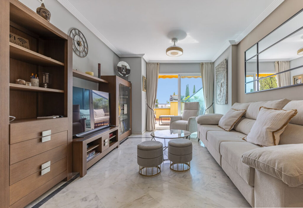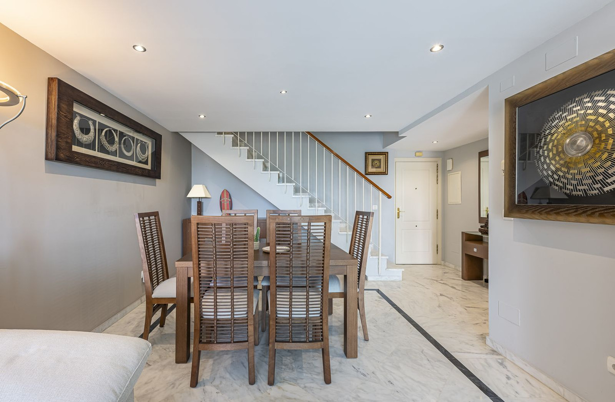 Exclusive opportunity! A stunning duplex penthouse with sea views, just a few steps from the beach in the prestigious Bahia de Marbella. Discover the charm of this property in one of the most privileged areas of Marbella. This property is distributed over two floors and offers an exceptional design and luxury amenities! On the main floor, you are welcomed by a spacious living-dining room that opens onto a sunny terrace overlooking the sea and the gardens, a fully fitted independent kitchen with modern appliances together with a laundry room and a guest toilet, complete this level. On the first floor is the master bedroom with a renovated en-suite bathroom and a private terrace offering stunning sea views, a perfect corner to enjoy the tranquility and beauty of the surroundings. In addition, two spacious bedrooms with fitted wardrobes share another large terrace with open sea and mountain views, along with a modern bathroom equipped with a shower. The property is equipped with hot/cold air conditioning to guarantee comfort at any time of the year. With an unbeatable location in an exclusive urbanisation with communal swimming pools and well maintained gardens. Walking distance to one of the best beaches in Marbella! Total built area: 140,28m2 Year of construction: 2002 Community fees: 220€/ month IBI: 1.200€.