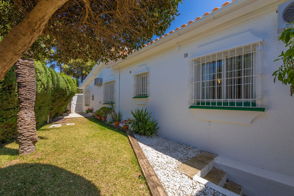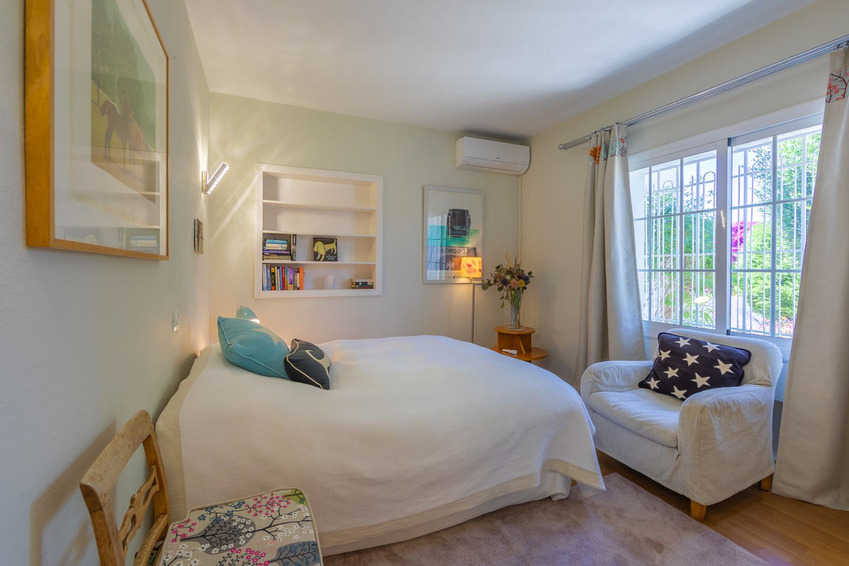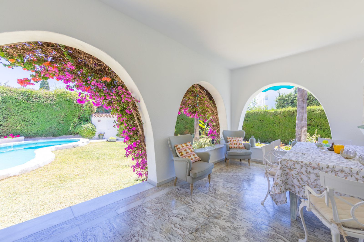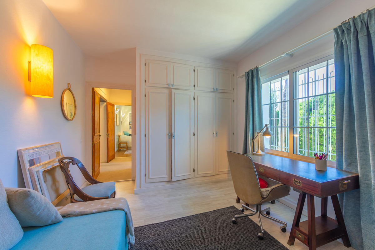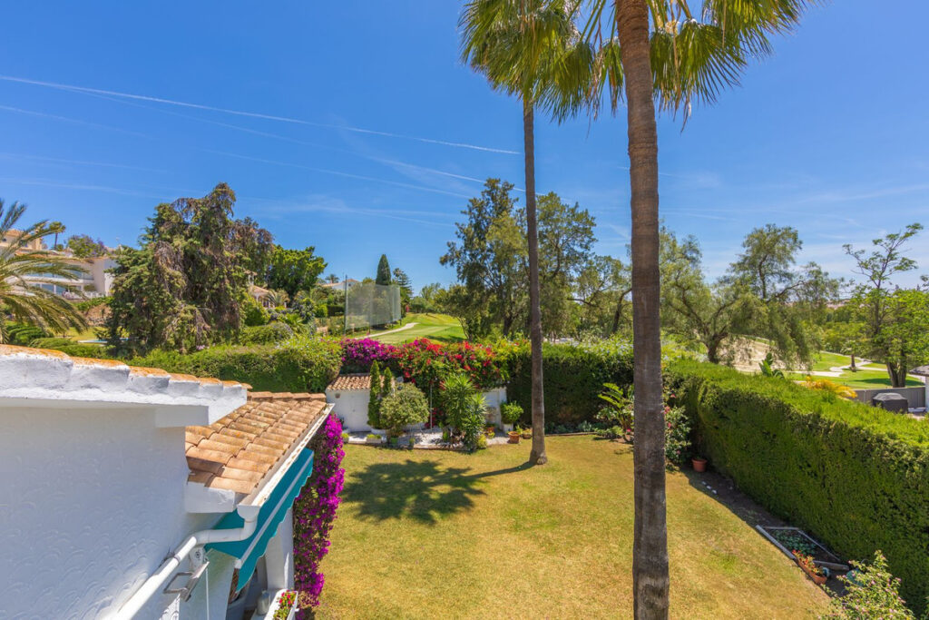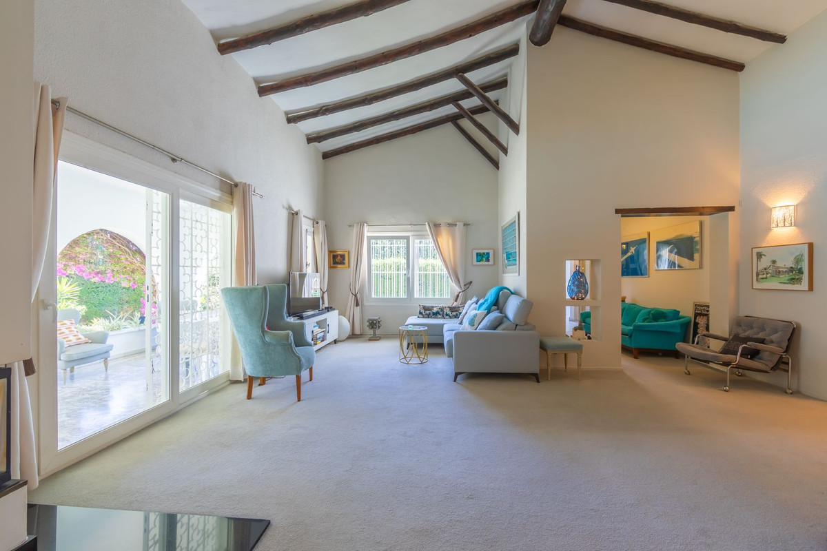 VILLA WITH ATTRACTIVE AND BEAUTIFUL MEDITERRANEAN CHARACTER, DISTRIBUTED ON A COMFORTABLE GROUND FLOOR AND LOCATED ON THE FIRST LINE OF GOLF, OF THE PRETIGIOUS REAL CLUB DE GOLF DE GUADALMINA. Located in a corner, in a cul de sac, located by the 18th Tee of the south . Enjoy a beautiful mature garden, very well maintained, with a multitude of trees and plants. LOCATED, 2 km from San Pedro de Alcántara and 6 km from Puerto Banús. Estepona and Marbella 15 min. Restaurants, Shops, and Leisure Areas just a 10-minute walk away and the beach a 5-minute drive away. Completely surrounded by Golf Courses and just a 3-minute walk from the golf clubhouse. (Golf share optional). Enjoy complete tranquility and privacy. South facing with great light and relaxing views of its excellently maintained mature garden and pool. It has a parking area for 2 cars at the entrance of the house plus a closed garage. In good condition and magnificently built, this property is distributed on a very comfortable single level. With a living room with high ceilings with wooden beams and direct access to the porch, garden and the kidney-shaped pool. The master bedroom en-suite with dressing room and direct access to the garden. A large and very bright kitchen with also high beamed ceilings and a dining area located next to the access to the parking area. The other good size bedrooms share 2 full bathrooms. The home has the option of separating an apartment by a door. From the cozy solarium enjoy relaxing views of the garden, golf courses and mountains. It also features a semi-basement with access from outside the house that could be used as a gym, games room, etc. It has great possibilities to change its distribution. We highly recommend visiting this fantastic property.