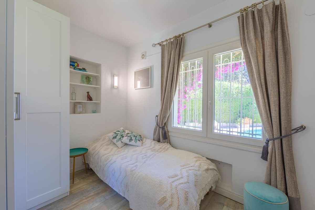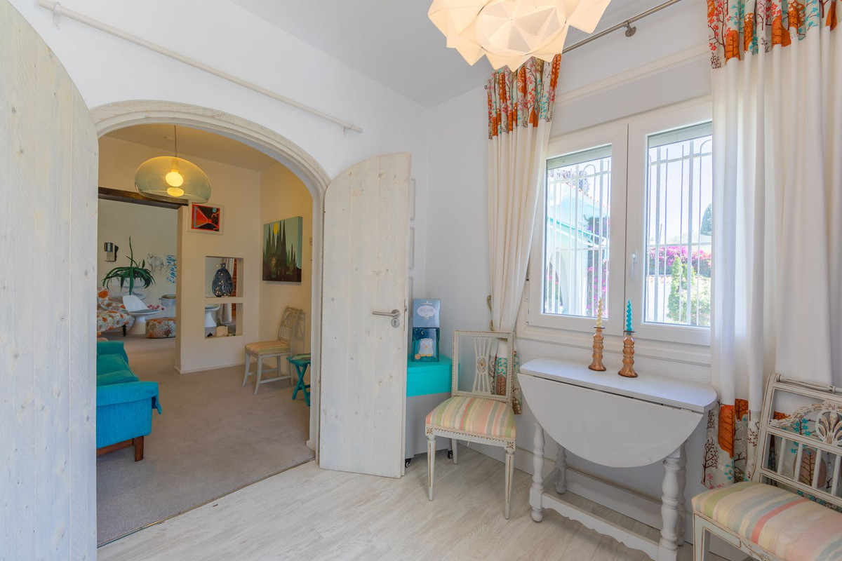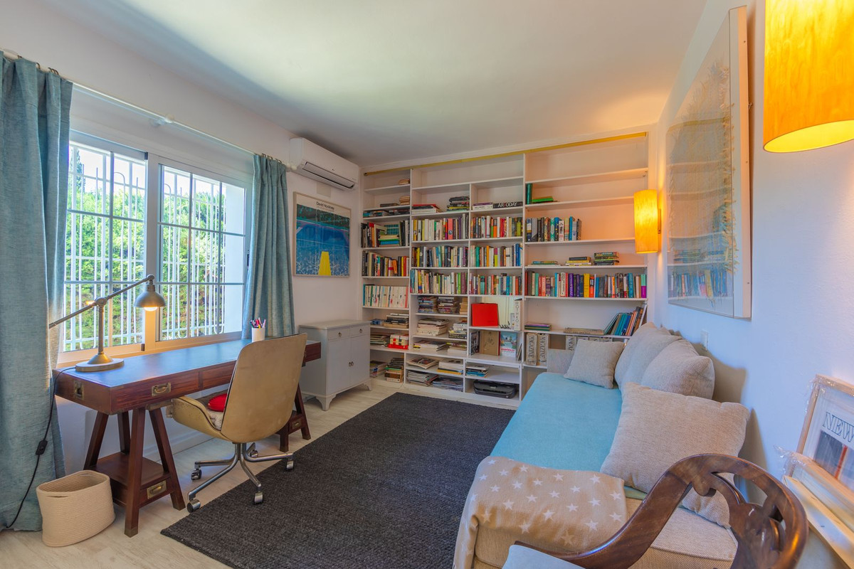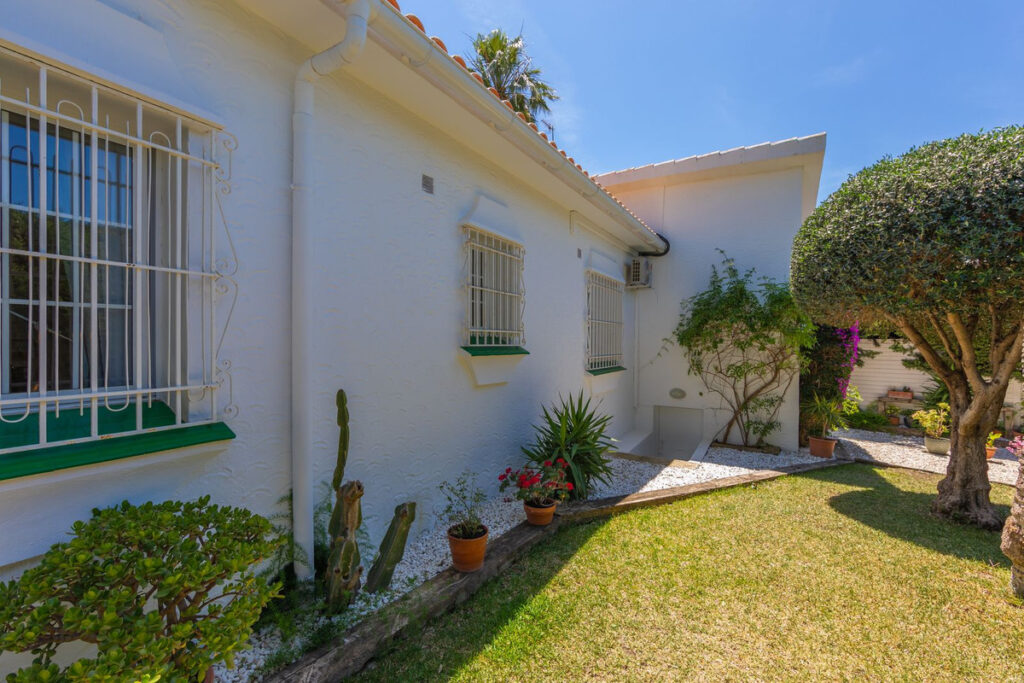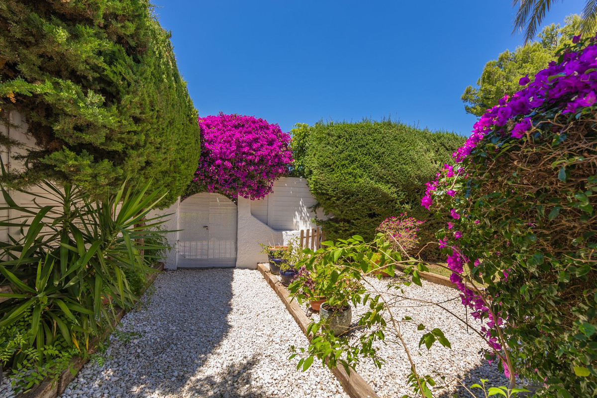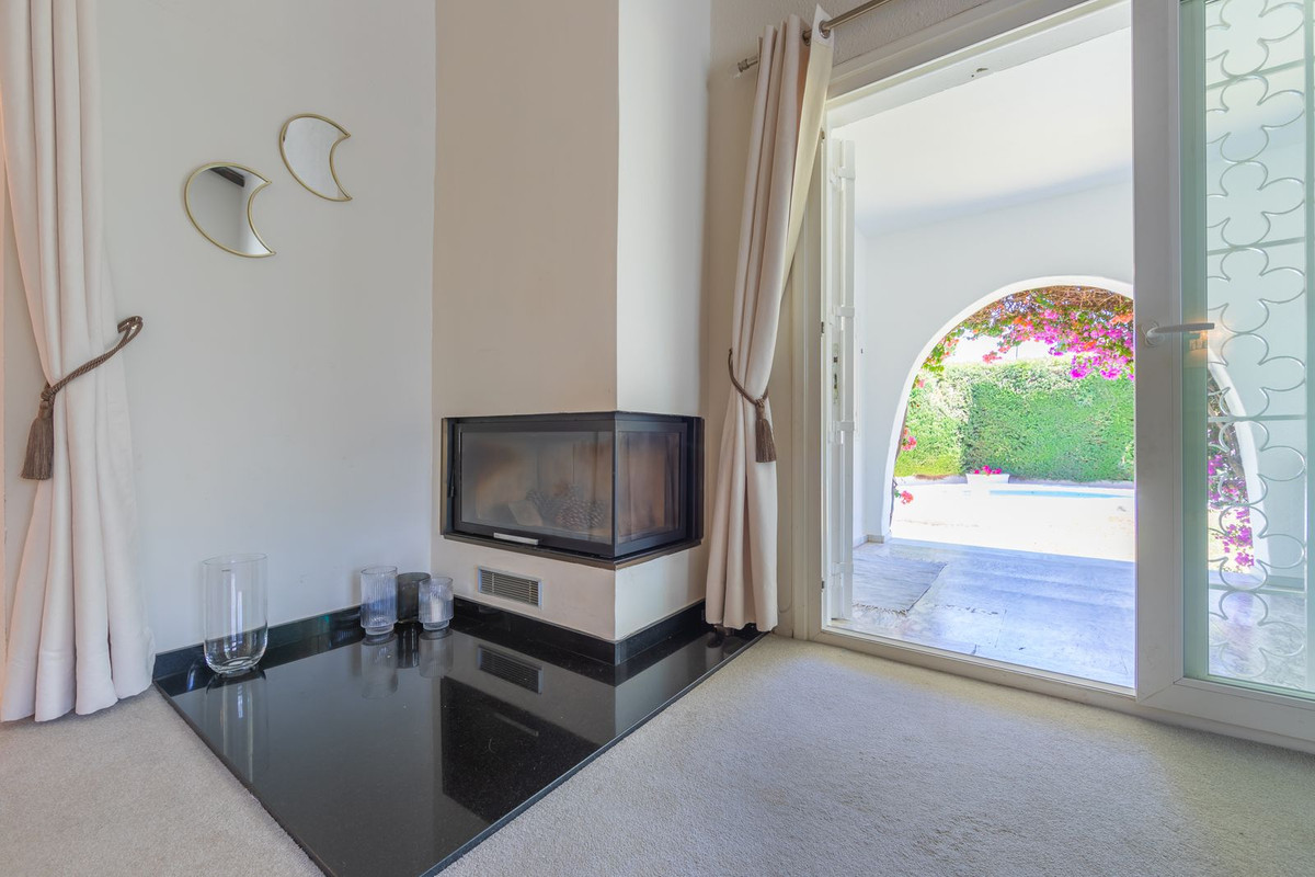VILLA WITH ATTRACTIVE AND BEAUTIFUL MEDITERRANEAN CHARACTER, DISTRIBUTED ON A COMFORTABLE GROUND FLOOR AND LOCATED ON THE FIRST LINE OF GOLF, OF THE PRETIGIOUS REAL CLUB DE GOLF DE GUADALMINA. Located in a corner, in a cul de sac, located by the 18th Tee of the south . Enjoy a beautiful mature garden, very well maintained, with a multitude of trees and plants. LOCATED, 2 km from San Pedro de Alcántara and 6 km from Puerto Banús. Estepona and Marbella 15 min. Restaurants, Shops, and Leisure Areas just a 10-minute walk away and the beach a 5-minute drive away. Completely surrounded by Golf Courses and just a 3-minute walk from the golf clubhouse. (Golf share optional). Enjoy complete tranquility and privacy. South facing with great light and relaxing views of its excellently maintained mature garden and pool. It has a parking area for 2 cars at the entrance of the house plus a closed garage. In good condition and magnificently built, this property is distributed on a very comfortable single level. With a living room with high ceilings with wooden beams and direct access to the porch, garden and the kidney-shaped pool. The master bedroom en-suite with dressing room and direct access to the garden. A large and very bright kitchen with also high beamed ceilings and a dining area located next to the access to the parking area. The other good size bedrooms share 2 full bathrooms. The home has the option of separating an apartment by a door. From the cozy solarium enjoy relaxing views of the garden, golf courses and mountains. It also features a semi-basement with access from outside the house that could be used as a gym, games room, etc. It has great possibilities to change its distribution. We highly recommend visiting this fantastic property.