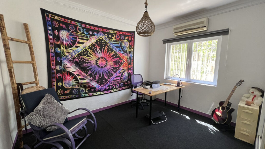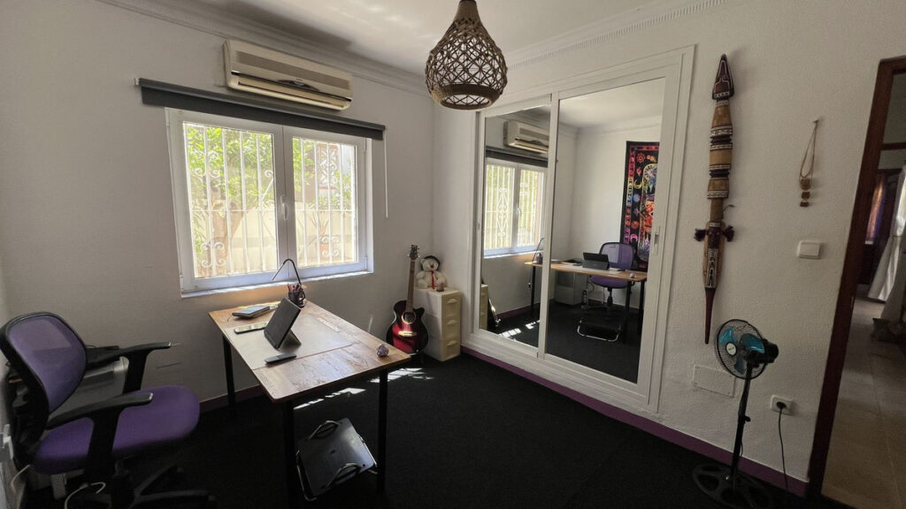 • Converted Space: The ground floor has been cleverly transformed to include a bedroom, a bathroom, a kitchen area, and a living room, offering an autonomous living space.