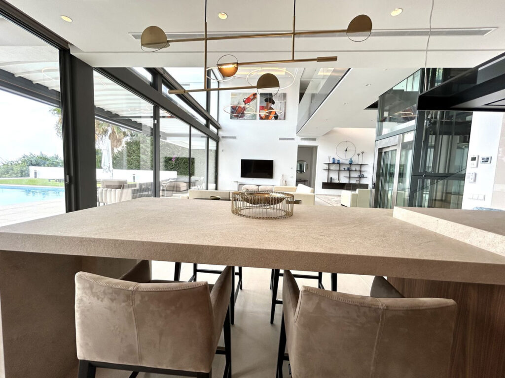 The villa is designed for ultimate comfort and entertainment. It offers seven luxurious bedrooms, each with its own ensuite bathroom, providing complete privacy and convenience. Additionally, there are guest toilets on both the ground floor and in the basement. The expanded kitchen is a chef's dream, featuring a large island, an additional American-sized refrigerator and freezer, a large glass chiller, a hidden cooktop, and all Miele appliances.