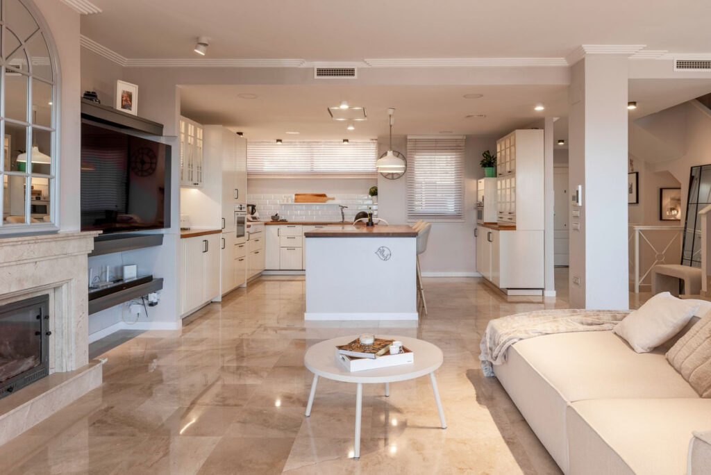 On the entrance level there is a spacious, living room with fireplace, open plan kitchen and dining area, guest toilet and a large terrace with spectacular sea and La Concha mountain views. The living room is very well lit, with panoramic terrace windows and an additional window at the dining table.