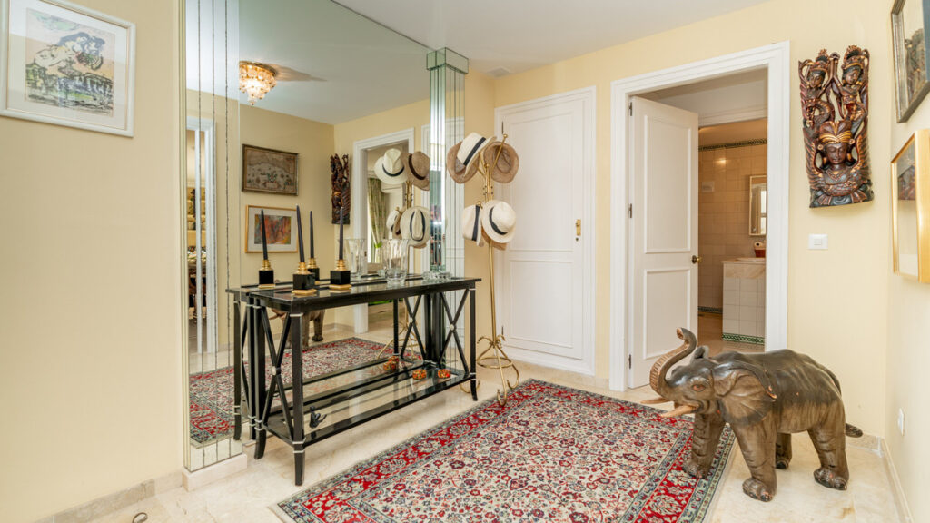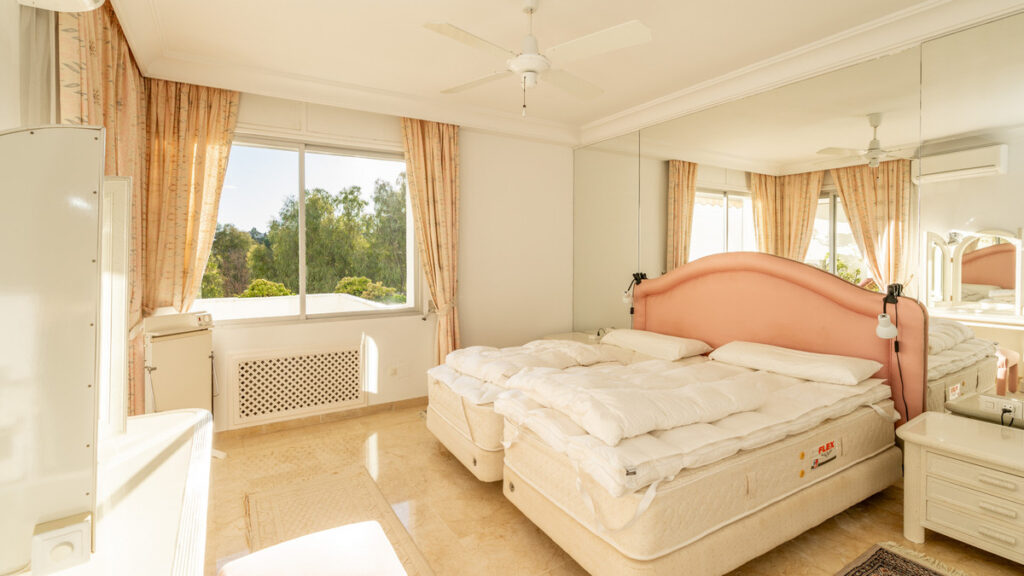 The apartment boasts three generously sized bedrooms and three bathrooms, ideal for both family living and entertaining. A newly renovated kitchen combines sleek design with outstanding functionality, while the expansive living area includes a charming fireplace and stylish marble floors. The southwest-facing orientation floods the space with natural light and offers beautiful sunsets from the large, covered terrace. Beyond the terrace are views of the Guadalmina River with its ever changing scenery.