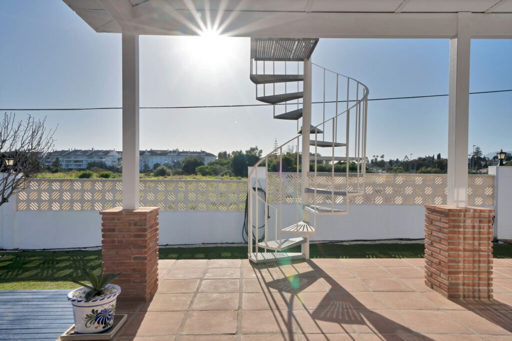The villa is built on a generous plot of 950m2 which has a well-maintained garden that includes a variety of fruit trees, planters & shrubs. There is a large free to form coverable swimming pool, outdoor shower and there is a very spacious area for entertaining and dining outdoors which has a separate build in BBQ, wine fridge and built-in sink unit. There is a spiral staircase where you can access the upper sun roof terrace to enjoy and capture the most amazing sunsets from here.