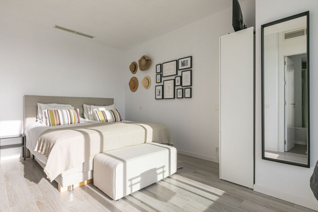 Walking up the elegant staircase, you reach the master suite—a true retreat. This spacious bedroom offers ultimate privacy, complete with an ensuite bathroom and direct access to an expansive private terrace. Here, you can bask in the sun, take in the panoramic coastal and mountain views, or unwind under the stars. You like the furniture and interior design, for a 15000€ it is yours (except for personal belongings) .