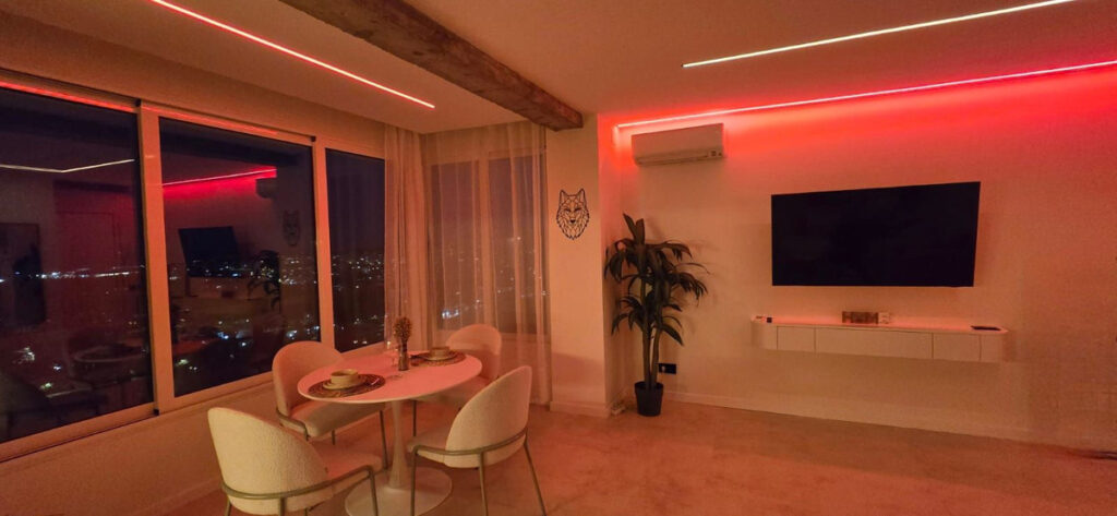 The fully equipped kitchen includes LED ambient lighting and top-tier German-made Bosch appliances, including a dishwasher and washing machine, all selected for performance and reliability.