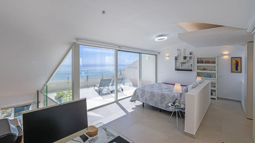 Built on 2 levels: on the entrance floor there are 2 cosy bedrooms, a complete bathroom, modern kitchen with SIEMENS appliances integrated in the living room and a magnificent terrace with barbecue area; and on the upper floor, to enjoy privacy and views we have the master bedroom, with dressing room and bathroom en suite, there is also the laundry room and a terrace-solarium with spectacular views.