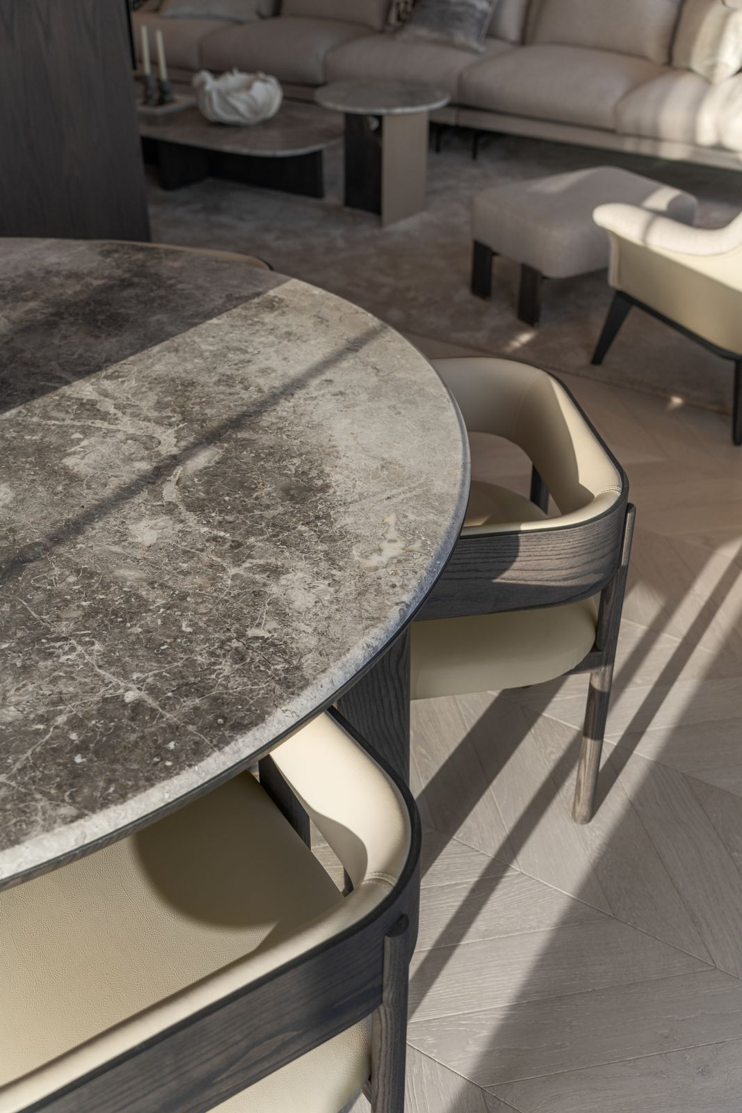 The bespoke kitchen, crafted with premium materials, is fitted with state-of-the-art Gaggenau appliances, offering both functionality and sleek aesthetics. The open-plan layout flows effortlessly into the dining and living areas, creating a bright and welcoming ambiance. Natural oak wooden flooring runs throughout the property, complemented by high-end furnishings by Alexandra Collection and custom-designed finishes, including elegant Gessi taps and fixtures.