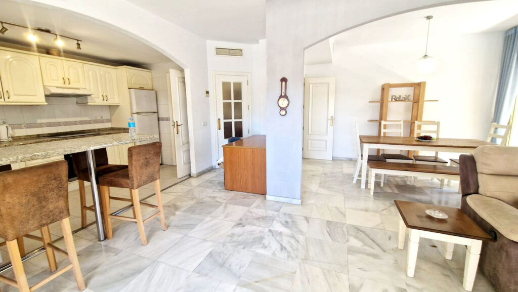 Originally a 3-bedroom property, the apartment has been cleverly redesigned into a spacious 2-bedroom home with a generous lounge and dining area, plus an open-plan kitchen with utility. Both bedrooms, as well as the living spaces, open directly onto the terraces, creating a wonderful indoor-outdoor flow. The master bedroom features a marble en-suite bathroom, while the guest bathroom is also finished in elegant marble.