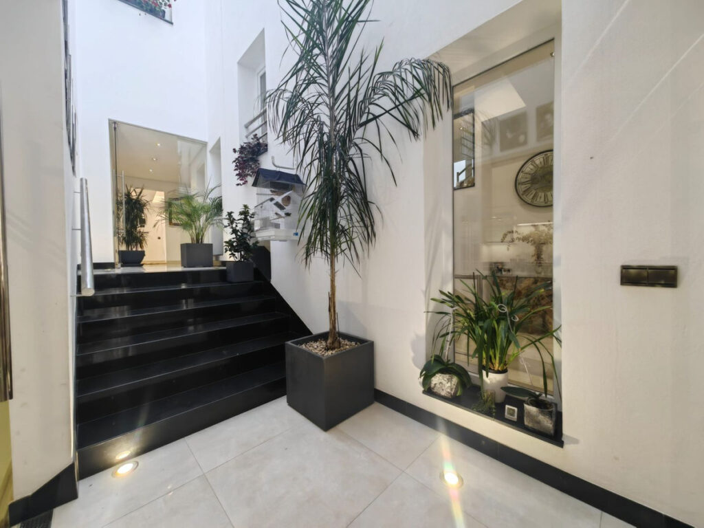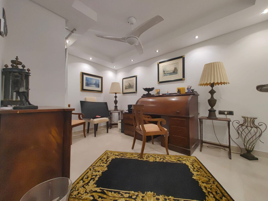 A central feature of the home is the dramatic atrium, rising all the way to the glass rooftop and acting as the light-filled core of the villa. A wide glass door opens into a spacious lounge and TV area, dining room, and a designer Schmidt kitchen fitted with top-of-the-line appliances including a Liebherr refrigerator. This entire floor is bathed in daylight, offering seamless flow and openness.