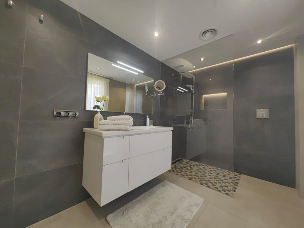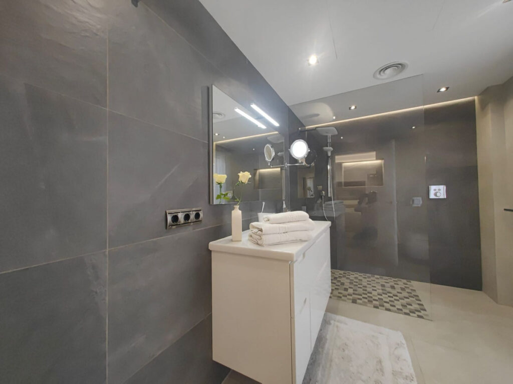 The first main bedroom suite features its own walk-in wardrobe, ensuite bathroom, and access to a wide passageway with extensive built-in storage. The highlight here is the entertainment terrace, blending covered and open-air spaces and equipped with plasma screen, BBQ, second kitchen, LED lighting, and laundry room. It's a space made for alfresco living under the sun or stars.