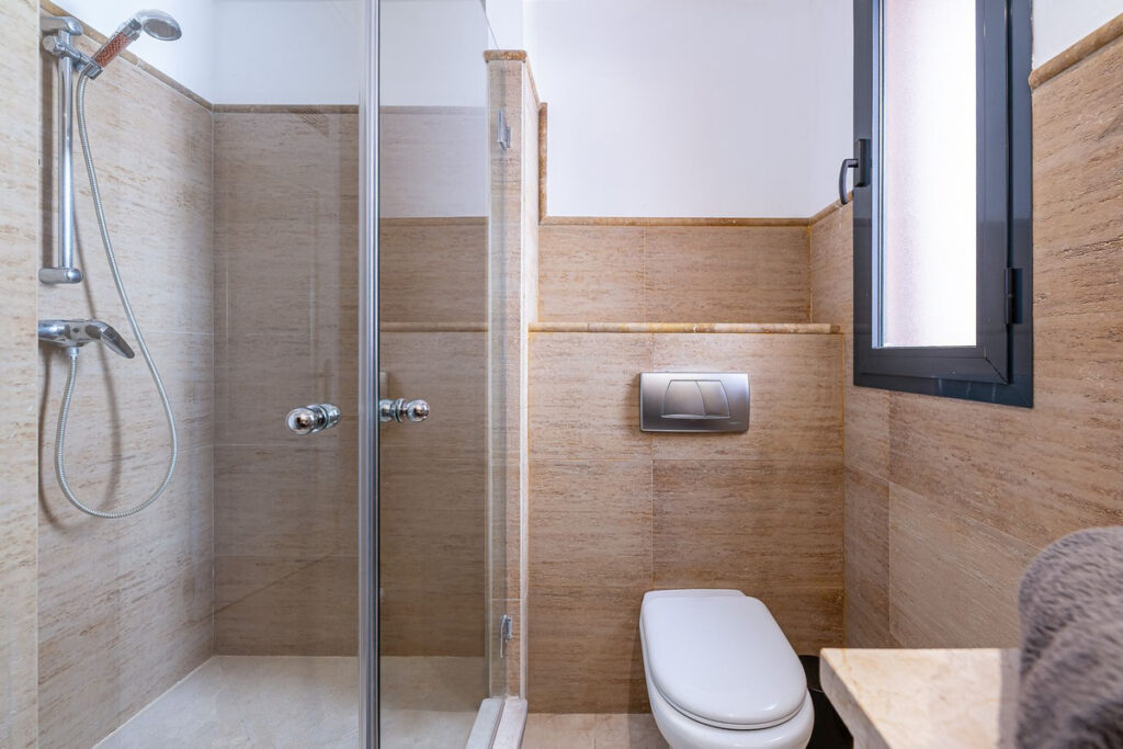 Facing south, the property enjoys abundant natural light throughout the day. The layout includes two spacious double bedrooms and two full bathrooms, one of them en suite, both featuring underfloor heating for added comfort. Every room benefits from exterior windows, enhancing brightness and ventilation.