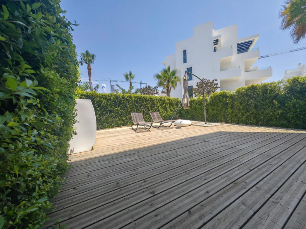 The bright and open-plan living area extends effortlessly onto a large, semi-covered south-facing terrace with partial sea views, creating the perfect setting for enjoying the Costa del Sol’s sunshine all day long. At the rear, a private garden with wooden decking provides a tranquil outdoor retreat, ideal for al fresco dining, barbecues, or simply unwinding.