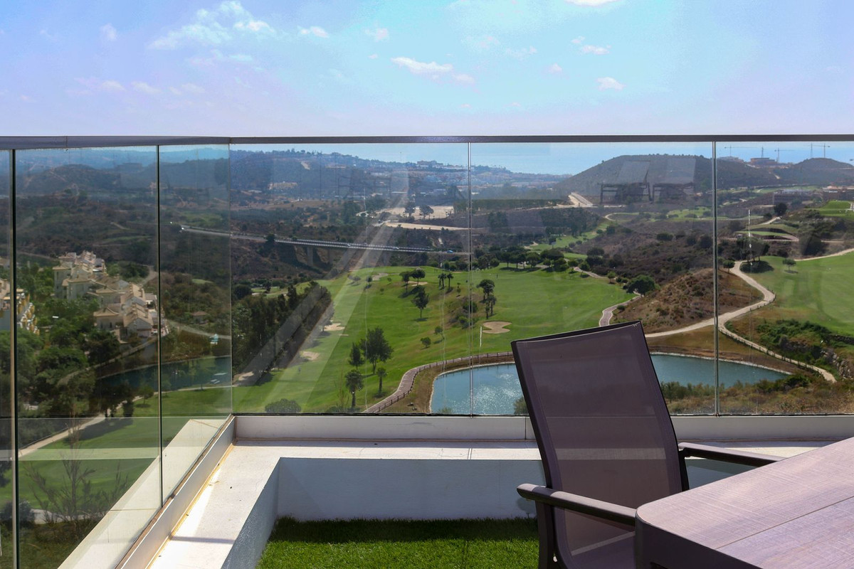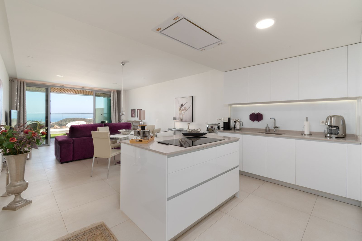 The open-plan kitchen – with sea views – flows seamlessly into the living area and lounge, creating an ideal environment for entertaining and interacting. Equipped with state-of-the-art appliances and a smart layout, this kitchen is a space where functionality meets modern design. From here, you can access the extra-large terrace, which offers panoramic views of the sea, golf, and mountains and is perfect for al fresco dining, relaxing in the sun, or enjoying the scenery. The covered section of the terrace has been enclosed with Lumon glass curtains, making it a versatile space to be enjoyed comfortably throughout the year, while still preserving the open views and natural light.