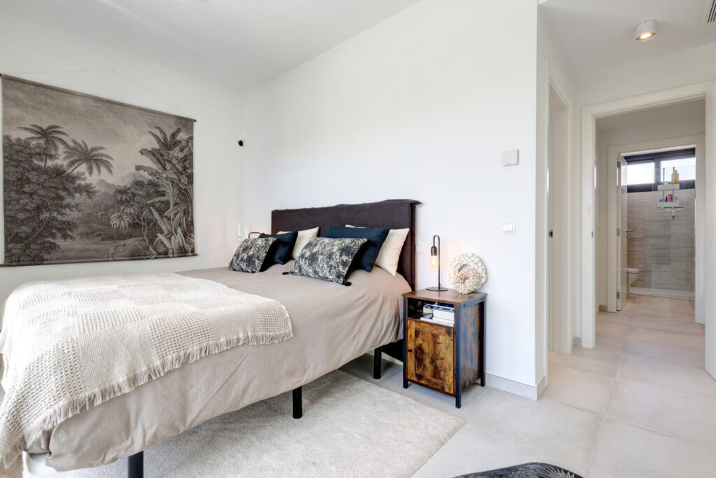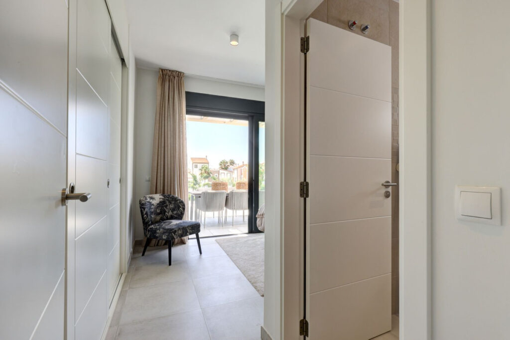 The master bedroom includes an en-suite bathroom, large built-in wardrobes, and direct access to the terrace, allowing natural light and cross ventilation. The second bedroom is also spacious and features built-in wardrobes. Both bathrooms are finished with high-quality materials and a functional yet elegant design.