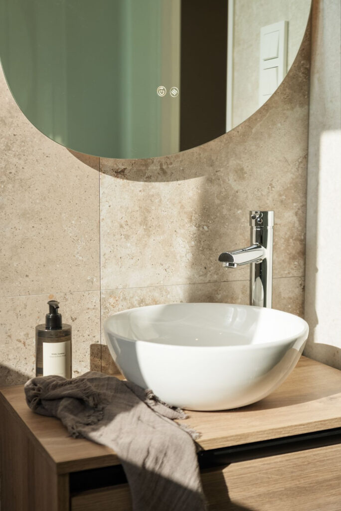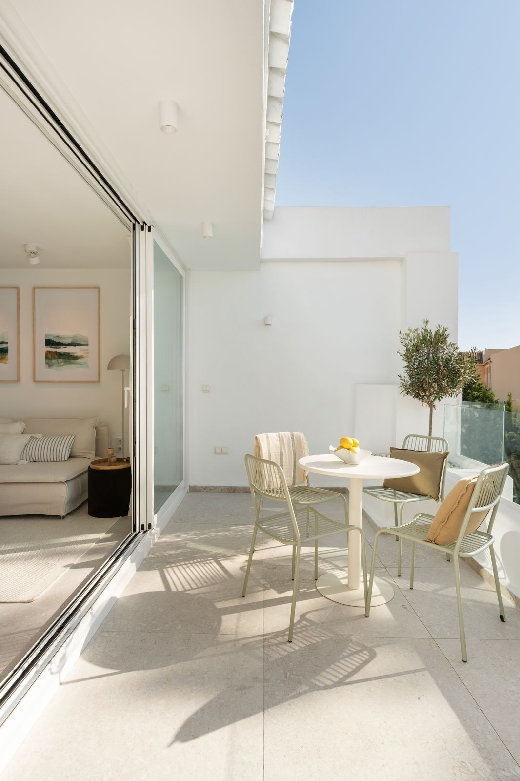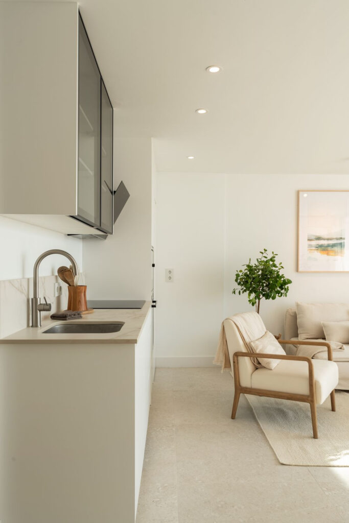 As you step inside, you are greeted by an open, light-filled space where the living room and terrace flow seamlessly together, thanks to bespoke floor-to-ceiling windows from Cortizo. From here, enjoy breathtaking panoramic views of the Mediterranean Sea accompanied by the peaceful sound of birdsong.