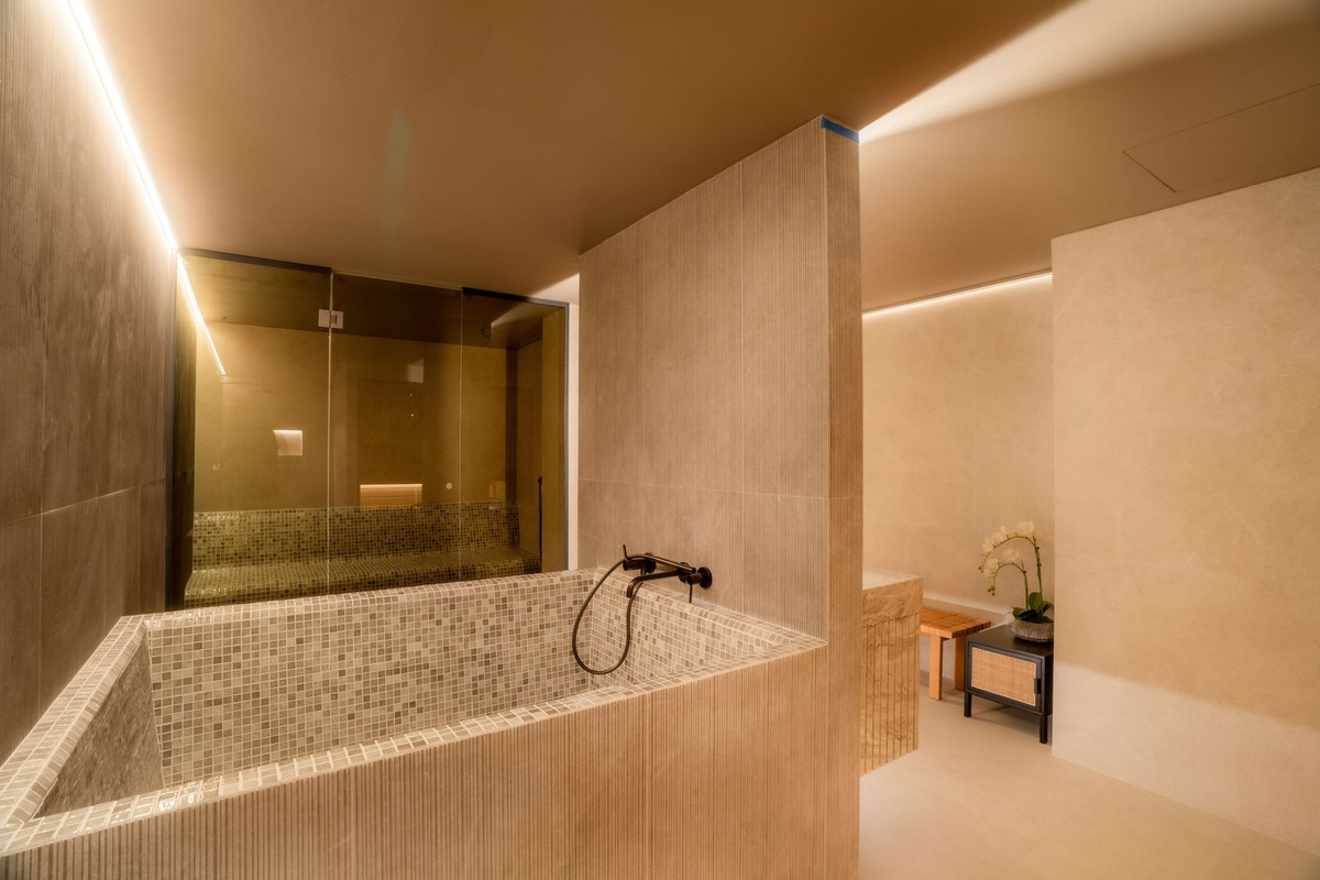 On the lower level, the home transforms into a full-scale entertainment and wellness retreat, complete with a custom bar and lounge, a private cinema room, and a dedicated spa area featuring a traditional hammam, Finnish sauna, plunge bath, and dual rain showers — bringing the full luxury experience into your everyday life.