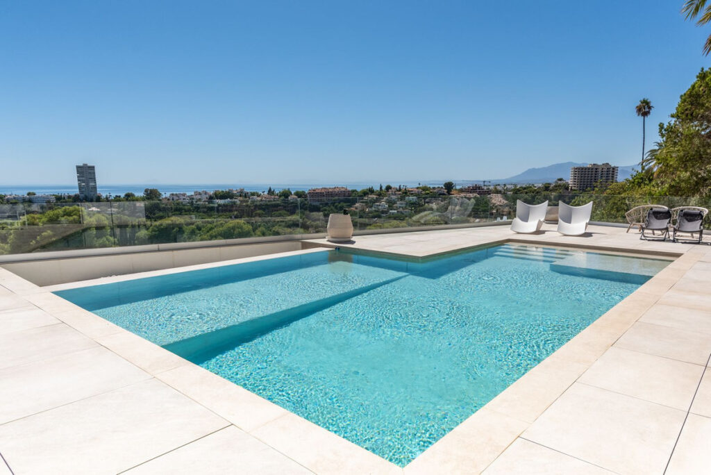 This stunning villa, fully renovated in 2023 with the finest materials, is south-facing and offers a panoramic view of the Mediterranean Sea and the Strait of Gibraltar, in a setting of total privacy with no overlooking neighbors.