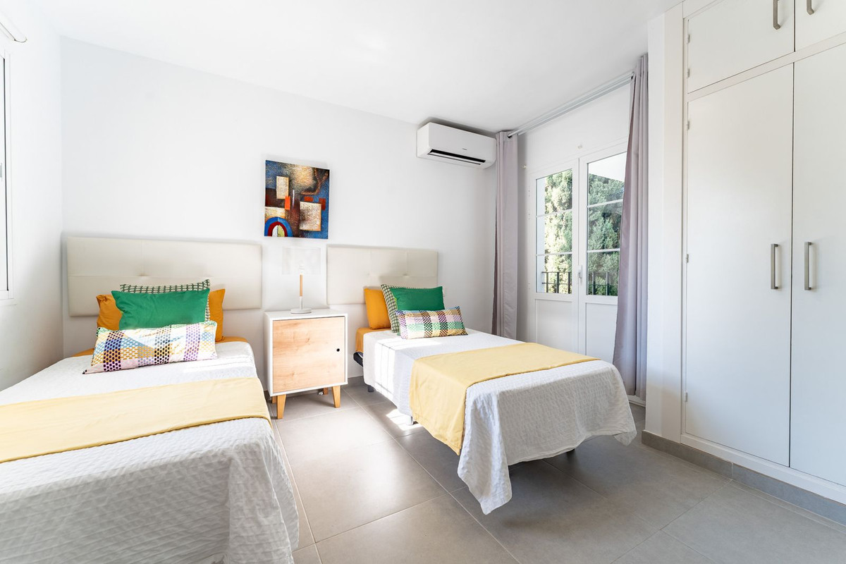 This beautifully renovated and show quality townhouse with TOURISTIC LICENCE FOR HOLIDAY RENTALS is located in the prestigious Mijas Golf area within walking distance to all amenities and public transport. It is set in the tranquil gardens of a gated, secure community.There are two floors plus a large basement which has also been renovated to include a new bathroom, lounge and office (this could easily be a third bedroom if required). On the ground floor, there is a modern kitchen, hallway with guest toilet and a lounge/dining room area that exits onto the stunning community gardens. On the upper floor, there are two spacious double bedrooms and two modern bathrooms. The sale includes all furniture, fixtures and fittings. It is well located with easy access to shops, bars and restaurants. Just outside the urbanisation there is a bus stop that takes you to Fuengirola and Enterrios. There are two hotels close by; Hotel Tamisa and the luxury La Zambra Hotel. In addition,there are two 18 hole golf courses and a driving range next to the property that includes an excellent bar/restaurant which is open all day to the general public. The house is ideal for use either as a holiday home or long/short term rental investment. 7 minutes to La Cala de Mijas. 5 minutes to Fuengirola. Viewings can be at short notice if required. Open to offers.