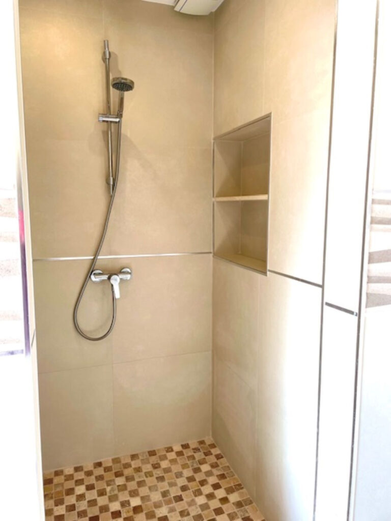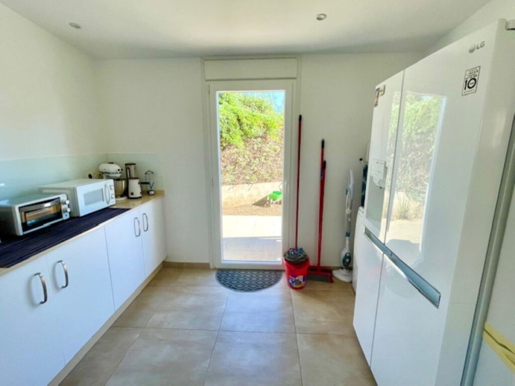 The large living room on the ground floor is approximately 50M2 and has its own open fireplace, for those cool winter evenings. For the summer, the property has reverse cycle air-conditioning throughout (hot and cold). The remainder of the ground floor comprises a large kitchen diner with a utility room, which is accessed from the living room. There is a delightful the wrap-around terrace off the kitchen, to have your breakfast watching the sunrise, which has also been partially covered to give shade in the summertime. Again, you have sea views from the living room and terrace.