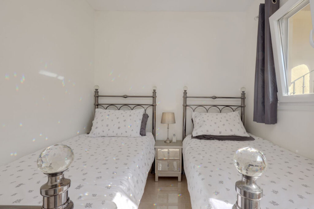 Upstairs there are 2 full bedrooms and a smaller 3rd bedroom and a full shared bathroom. The main bedroom has it's own private terrace and sea and golf views.