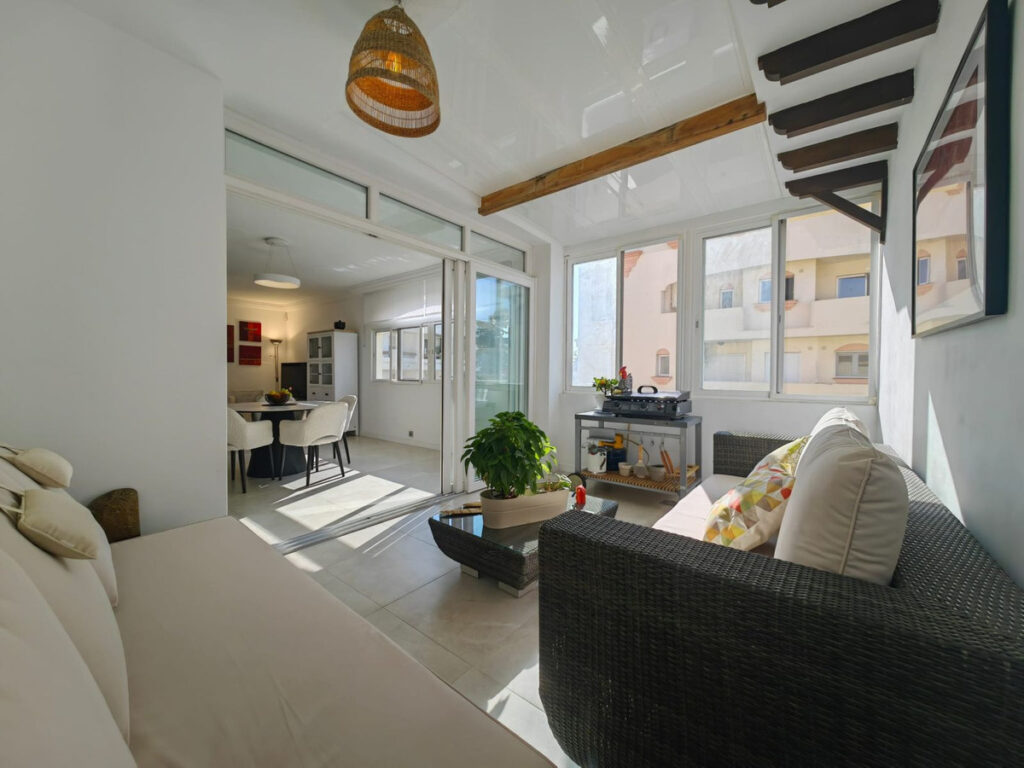 The apartment welcomes you with an elegant central lobby. To the right, a spacious open-plan kitchen, dining, and lounge area unfolds, seamlessly connecting to a covered terrace with a fully furnished lounge — ideal for enjoying sunny mornings and the cooler shade of the afternoons thanks to its southeast orientation.