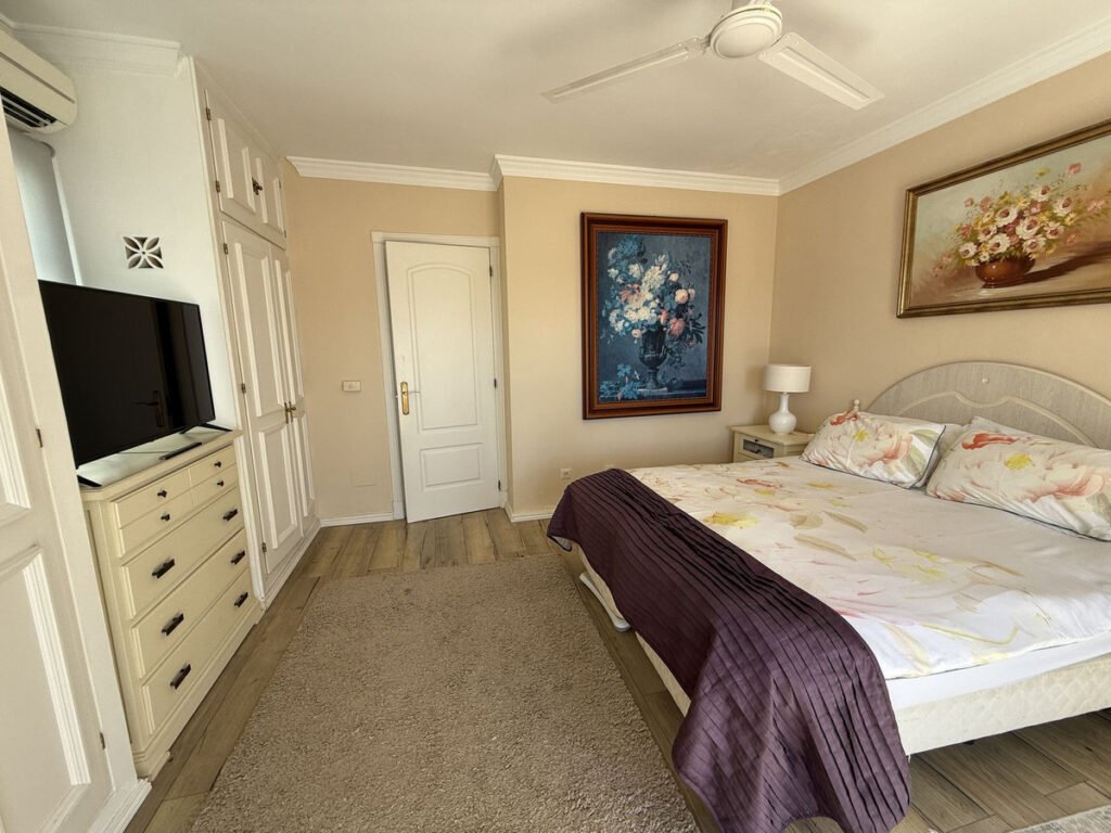 Upstairs, the master bedroom features ample wardrobes and a sunny south-facing terrace overlooking the garden, perfect for enjoying the Mediterranean climate. The second bedroom is located on the opposite side, and both rooms share a modern bathroom with shower.