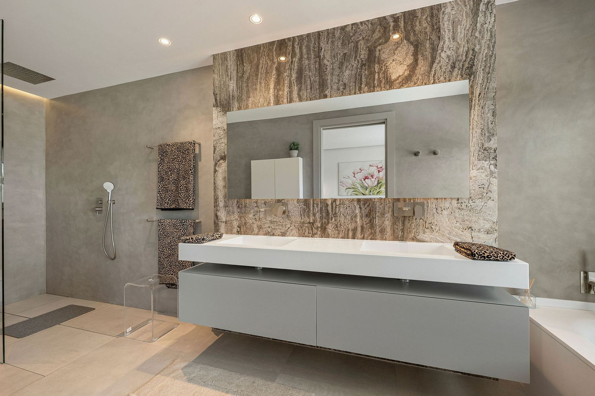Welcome to this modern and very well built house in the lower Nueva Andalucia area. As you enter you are greeted with a large open kitchen that leads to the dining and living area, from here you can access the large covered terrace and onto the pool area with ample space for sunbathing and with an outdoor shower. On the main floor you have a bedroom onsuite currently used as an office. On the first floor you have 3 bedroom onsuite, all with access to a covered terrace. From here you have stairs leading onto the solarium which has been fitted with solar panels yet leaving space to create an entertaining space. In the basement floor floor you have the laundry area, a 2nd guest toilet, a bedroom suite, a large room that could be used as a cinema room etc and lastly a large garage for up to 4 cars. All floors are accessed by stairs or an elevator. The technology in the house is modern with water based underfloor heating powered by aerothermic system, the ac is thorugh the Airzone system, water filters & solar panels make this house very efficient to live in. A house in a very central position makes this a perfect all year living or a holiday home with the added bonus of being an attractive rental property due to its size and location.