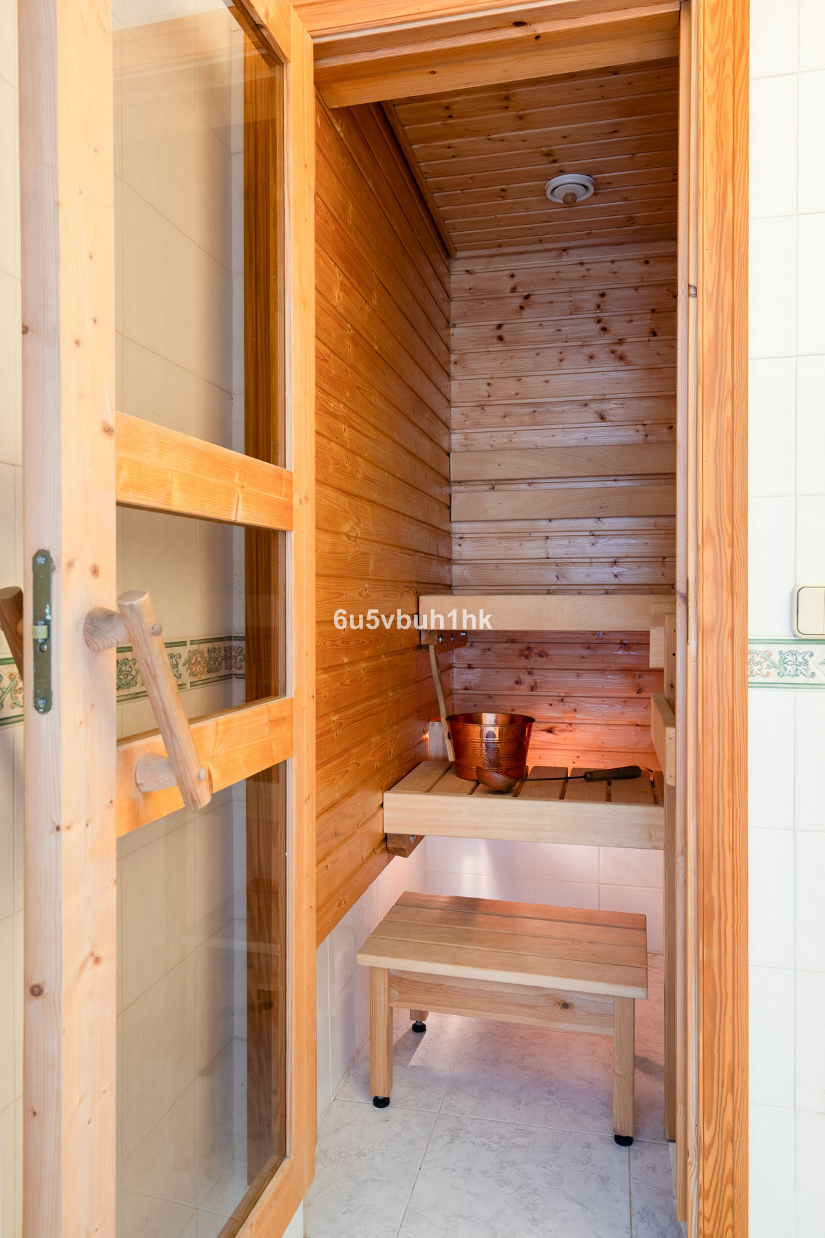 The lower floor offers two additional bedrooms, a bathroom, a laundry room and a private sauna. From here, there is access to a back patio, which can also be used as private parking.