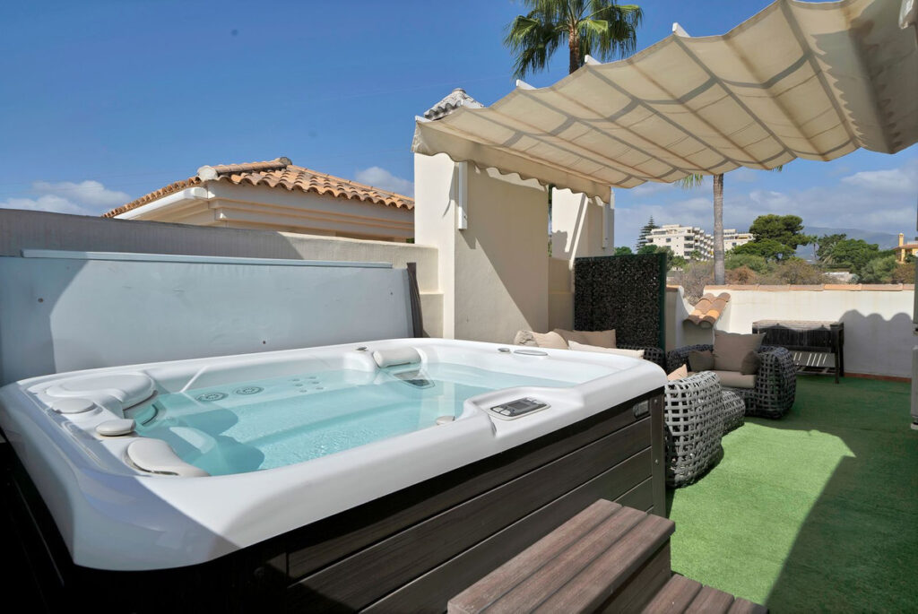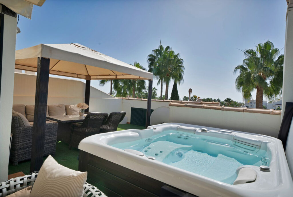 With over 300 m² built area, the property features 3 bedrooms, 2 bathrooms, and a guest toilet. The generous living and dining area opens onto a west-facing terrace overlooking the communal gardens and pool. The bright, fully equipped kitchen complements the home’s spacious layout, while the private rooftop solarium — complete with a jacuzzi — provides the perfect spot to relax and enjoy panoramic views.