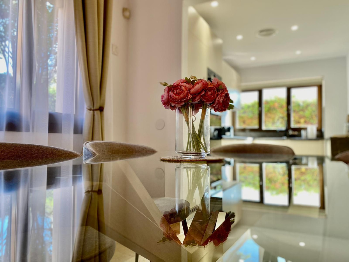 Groundfloor: Living and dining with huge glass table for 6, chimney, open to the new kitchen and leading to terrace. On this level you will find as well a guest toilet.