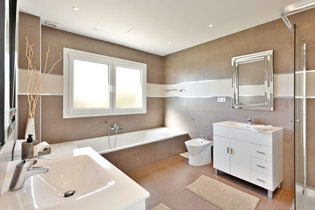 The property is built on 3 floors on a plot of 1438 m2 and is in very good condition. On the ground floor are 2 spacious lounge areas (one with biofuel burner fireplace), large central dining area with high ceiling, modern open-plan fully-equipped kitchen with built-in coffee machine and American fridge/freezer. Alongside the kitchen is a laundry room with washing machine and tumble dryer. There is also a guest toilet. On this level there is direct access through large sliding doors to a 70 m2 covered terrace with lounge area, dining area for 8 people and a large gas BBQ, all overlooking a lawned garden area with sea views. From this garden area there are 10 steps down to the large heated swimming pool which is very private.