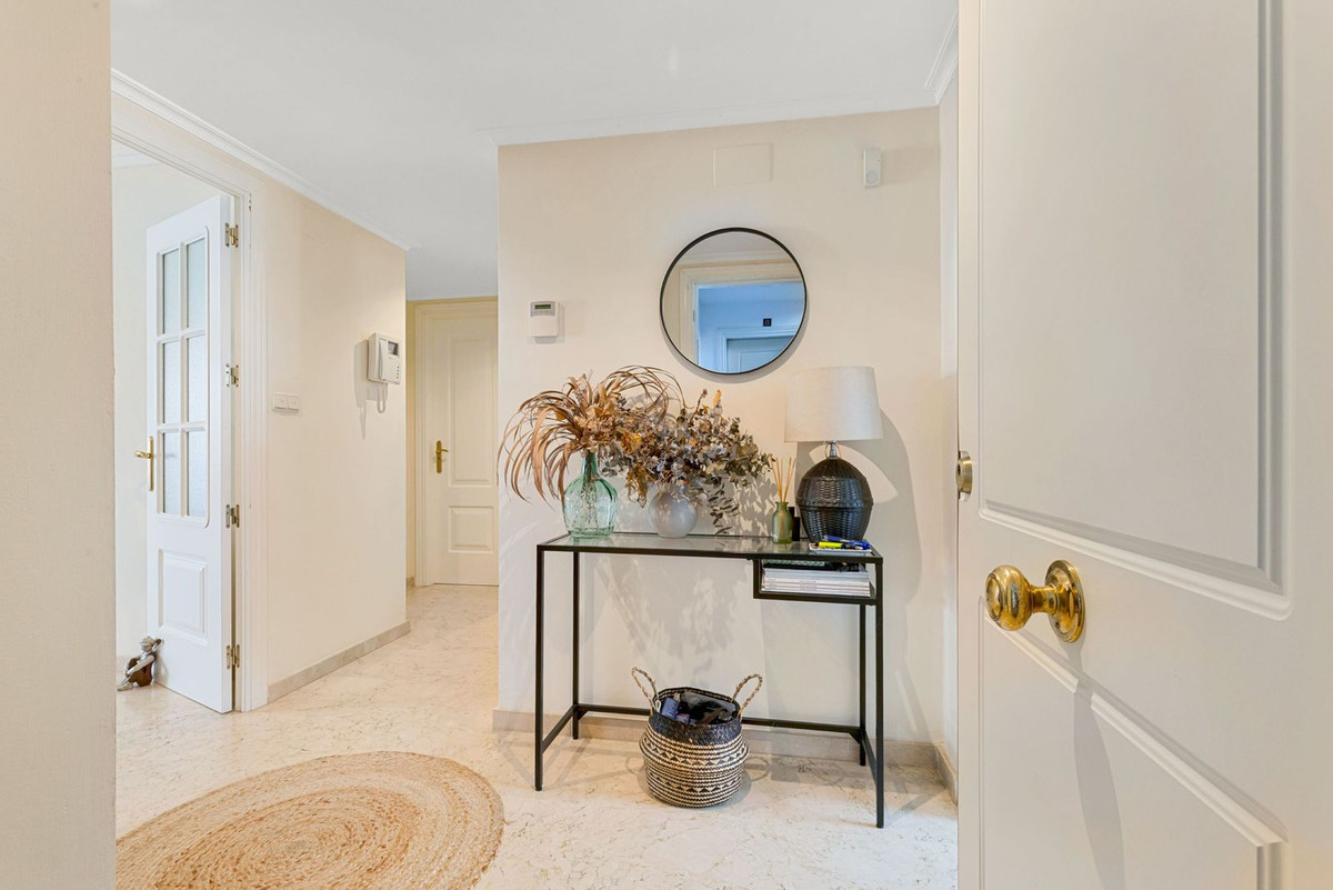 Magnificent southeast-facing two-bedroom apartment in Marbella, located in an exclusive private residential complex offering two swimming pools and spacious communal gardens, just a few steps from the beach and the Río Real golf course. This property, located on an elevated first floor, stands out for its spacious terrace with pleasant views of the green areas. Inside, it is distributed in an entrance hall, a spacious living-dining room with direct access to the partially covered terrace, a large separate kitchen with access to a generous laundry terrace, two bedrooms—the master bedroom being particularly spacious and bright thanks to a large window—and a bathroom. It also includes a large storage room and a parking space.