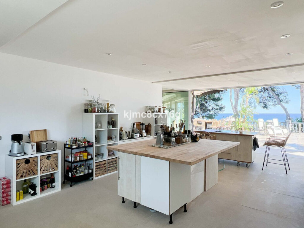 The designer kitchen with central island opens onto the terrace via folding glass doors, connecting effortlessly to the pool area, covered porch, and a glazed chill-out lounge with outdoor kitchen and BBQ — ideal for year-round entertaining.