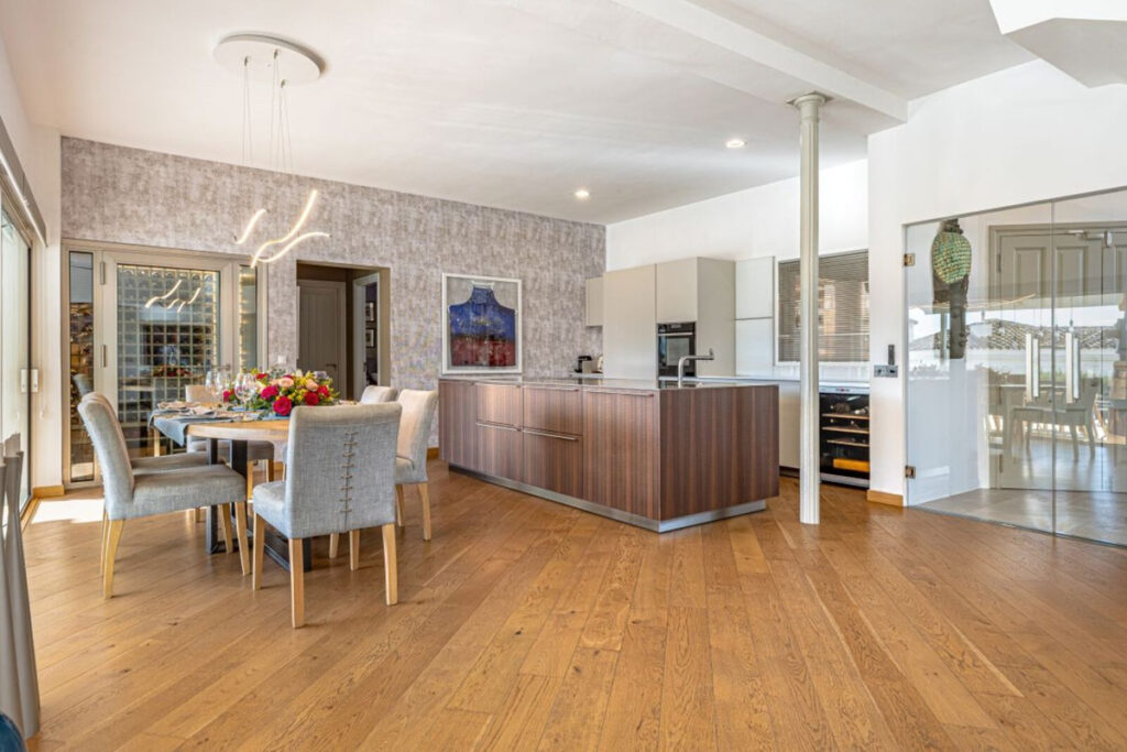 The main level welcomes you with a bright living room featuring a fireplace, a separate dining area, and direct access to covered and open terraces overlooking the garden and pool. A fully fitted Bulthaup kitchen provides ample storage and workspace, ideal for everyday living and entertaining. The villa offers five well-proportioned bedrooms, including a spacious master suite, and several bathrooms finished in a modern style.