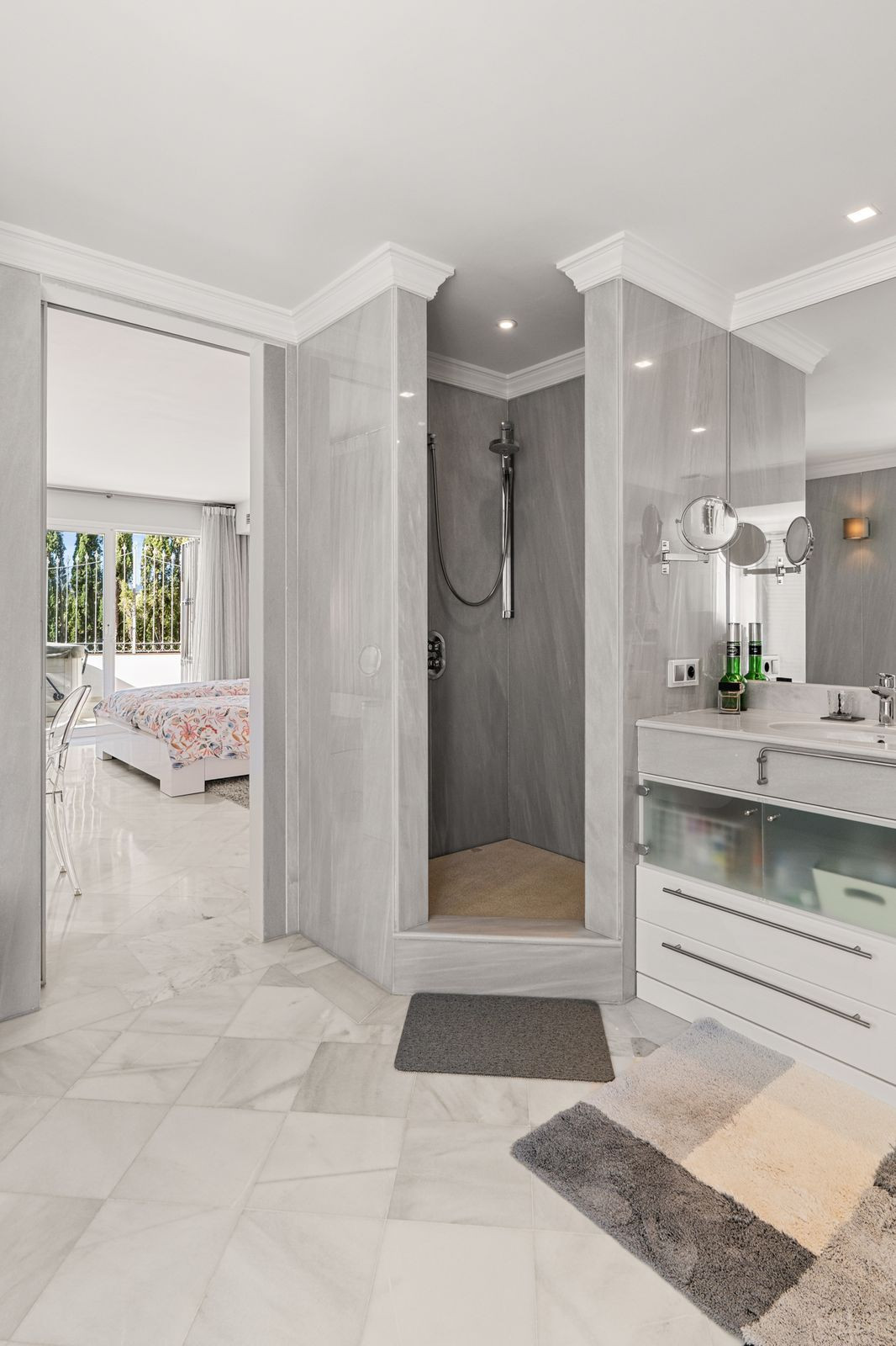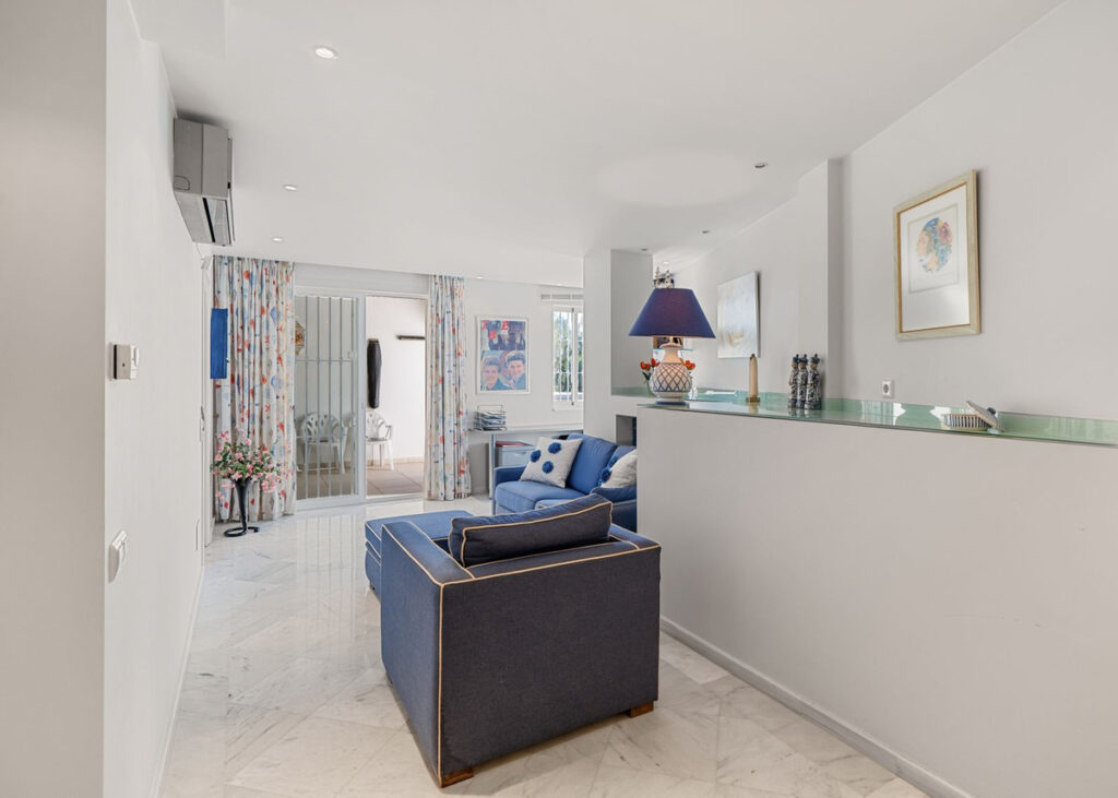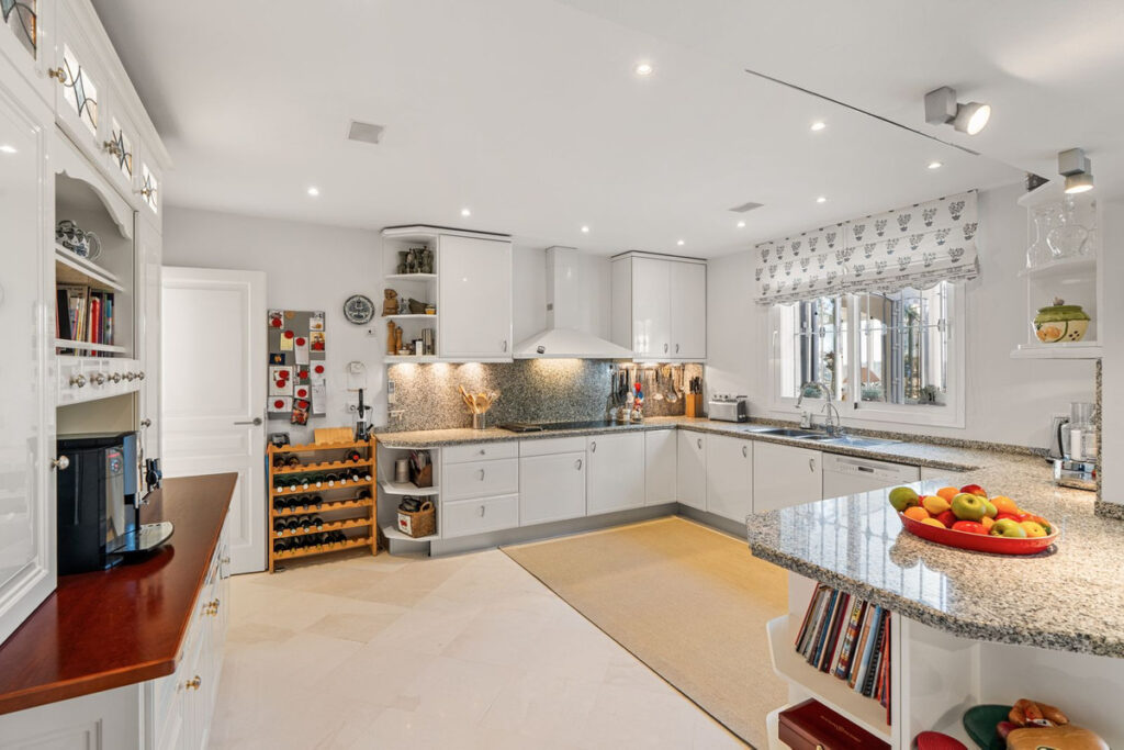 The fully fitted kitchen sits just around the corner, separate from the living area, and has direct access to one of the terraces, making it the ideal place to enjoy a slow breakfast outdoors. The kitchen also features an additional storage room with its own AC unit, perfect for keeping groceries in a good condition.