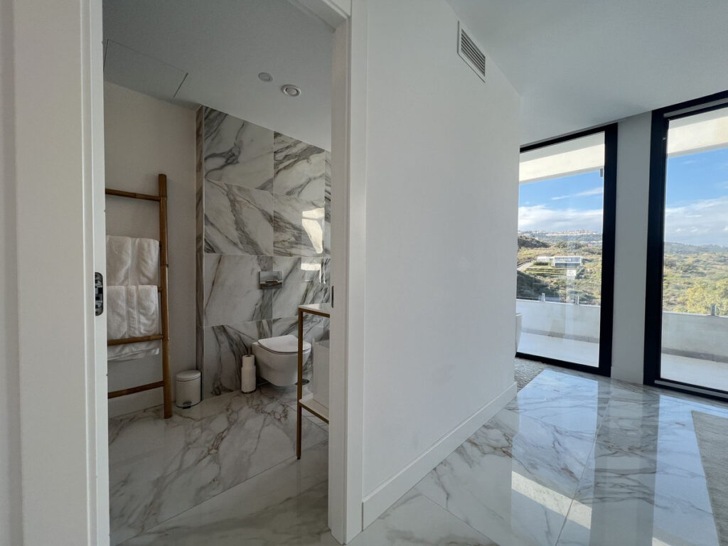 The upper floor comprises the master bedroom with built-in wardrobes and en-suite bathroom, as well as a second bedroom, also with fitted wardrobes and its own en-suite bathroom. From this level there is access to a spacious roof terrace with open panoramic views.