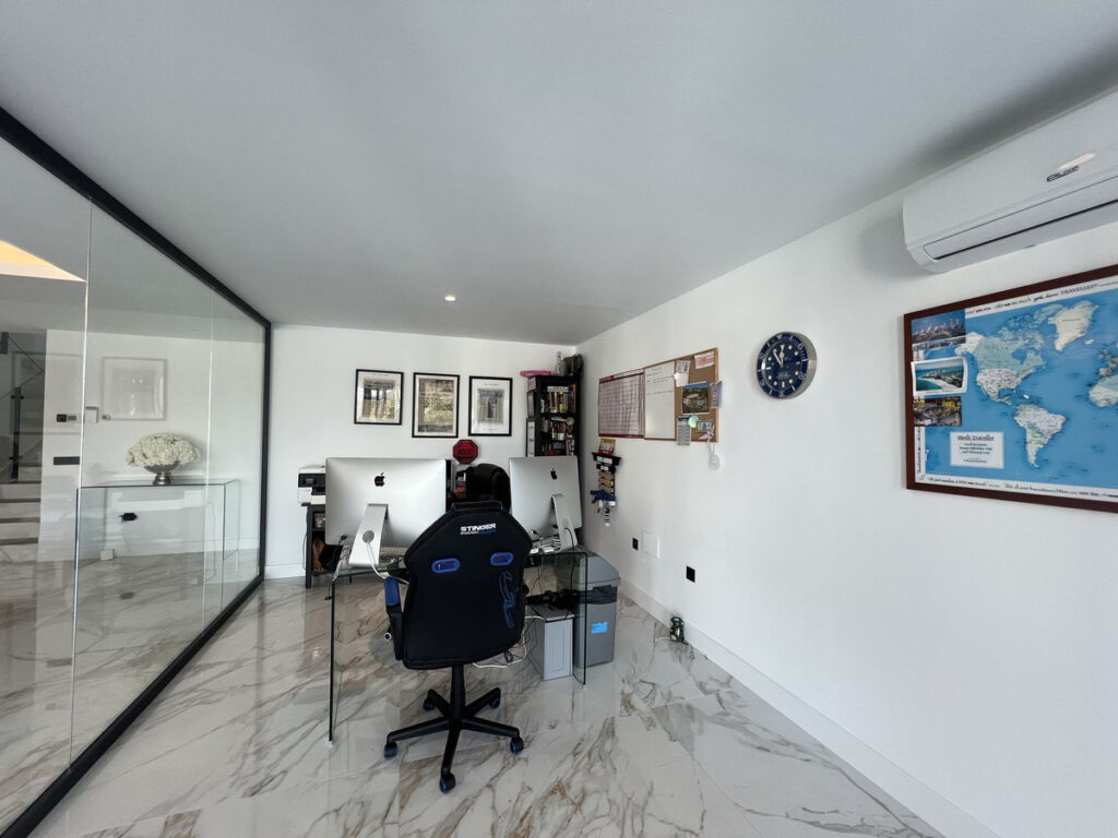 The basement level provides a large additional living area currently used as a lounge and entertainment space. This floor also includes a separate laundry room, storage area, a bedroom and a bathroom with shower. A glass-enclosed office space has been created, offering a practical work-from-home solution. This level offers further potential for additional uses such as a gym or wellness area.