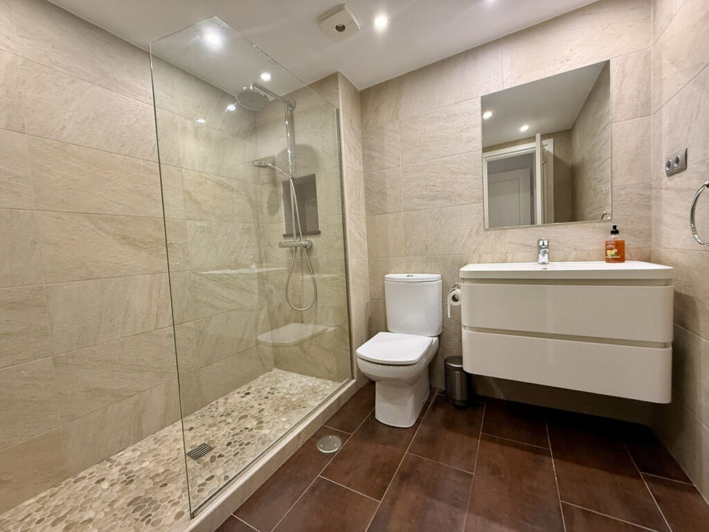 The master bedroom enjoys direct access to the terrace and includes a generous en-suite bathroom with double vanity. The second bedroom is equally well-proportioned and is served by its own separate bathroom. Additional features include marble flooring, full air conditioning and heating, videophone entry system, and electric shutters. The property also benefits from convenient access to covered parking with ample available spaces.
