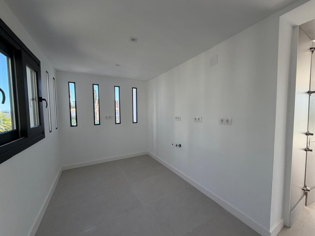 Filled with natural light, the villa boasts open-plan living areas with large windows and glass doors, seamlessly connecting indoor and outdoor spaces and enjoys open views with pleasant sea views. The modern open-plan kitchen features a large central island with an integrated cooking field, ideal for both everyday living and entertaining guests.