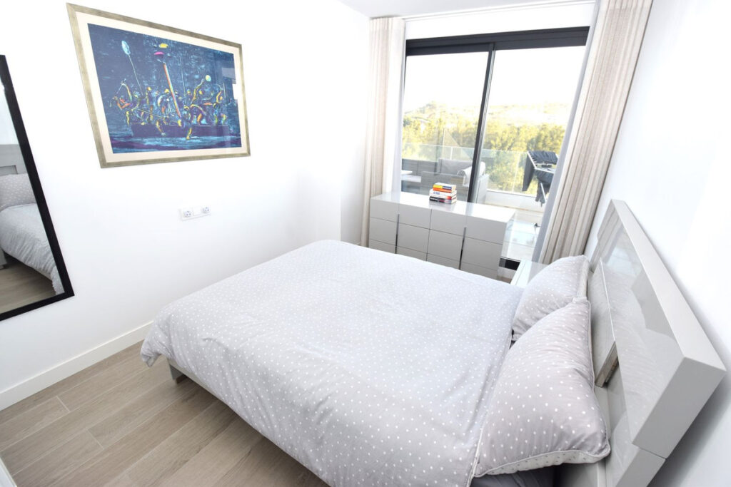 Fantastic, recently built apartment which is perfect for families who want to live in a spacious and comfortable home. It consists of a generous living-dining room, fully fitted open plan kitchen, equipped with Bosch electrical appliances, 3 bedrooms, 2 bathrooms, guest toilet and a utility room. The lounge and kitchen blend together seamlessly and with windows in the kitchen and floor to ceiling patio doors in the lounge this beautiful living space is flooded with natural light and fresh air. The master bedroom has an en-suite bathroom and walk-in closet. Bedrooms 2 and 3 also have built-in wardrobes and they share a shower room. Like the lounge, all bedrooms have direct access to the very spacious 55m2 terrace where you can enjoy stunning sunrises and views of La Noria Golf course and the surrounding area. The terrace from the lounge has glass curtains creating an extra room for use in the winter. In the summer you open the curtains to enjoy the full terrace space, the perfect solution for year round use. Air conditioning hot and cold, video intercom, under floor heating in lounge/dining room, kitchen and all bedrooms which together with the A/C and hot water are powered by an aero-thermal system. A secure underground parking space and private storage room are included in the price and there is a lift and stairs from the garage to all levels. With only two apartments on each floor this property has no neighbours on either sides and is therefore very private. Located in a gated community, with a large circular swimming pool for adults and a separately gated large children's swimming pool with night-time illumination, two paddle-tennis courts, children’s playground and landscaped garden this is a quality residential community perfect for permanent living or amazing family holidays. Within 10 minutes walk of La Cala Beach this is the perfect apartment for family holidays all summer. The owners added many extras to this apartment including, top of the range kitchen worktops, extractor built into the hob, shutters (persianas) added to kitchen and WC windows, glass screen on corner of terrace and sun shade (toldo) above the main seating area of the the terrace.