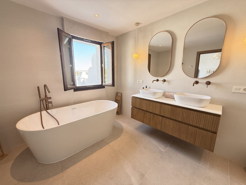 The master suite opens onto a private upper terrace with views over the golf course, mountains, and a distance glimpse of the Sea. All bathrooms are fully fitted, maintaining a consistent high-end finish throughout.