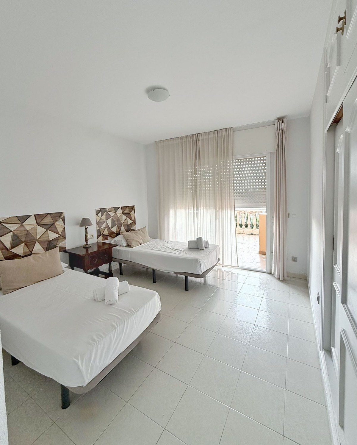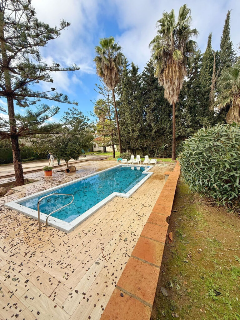 The upper floor offers four exterior bedrooms with fitted wardrobes and air conditioning, two of them with direct access to a private terrace overlooking the garden, swimming pool and outdoor areas.