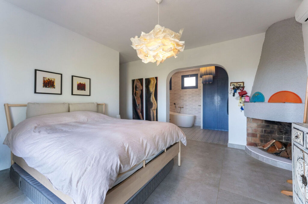 A hallway leads to the sleeping accommodation, where two guest bedrooms share a family bathroom, conveniently located between them. There is also a cloakroom and a large laundry/utility room offering further storage. The master bedroom, located at the end of the hallway, is a true retreat with direct access to the terrace, an open fireplace, and a stylish en-suite bathroom with a walk-in shower and freestanding bathtub.