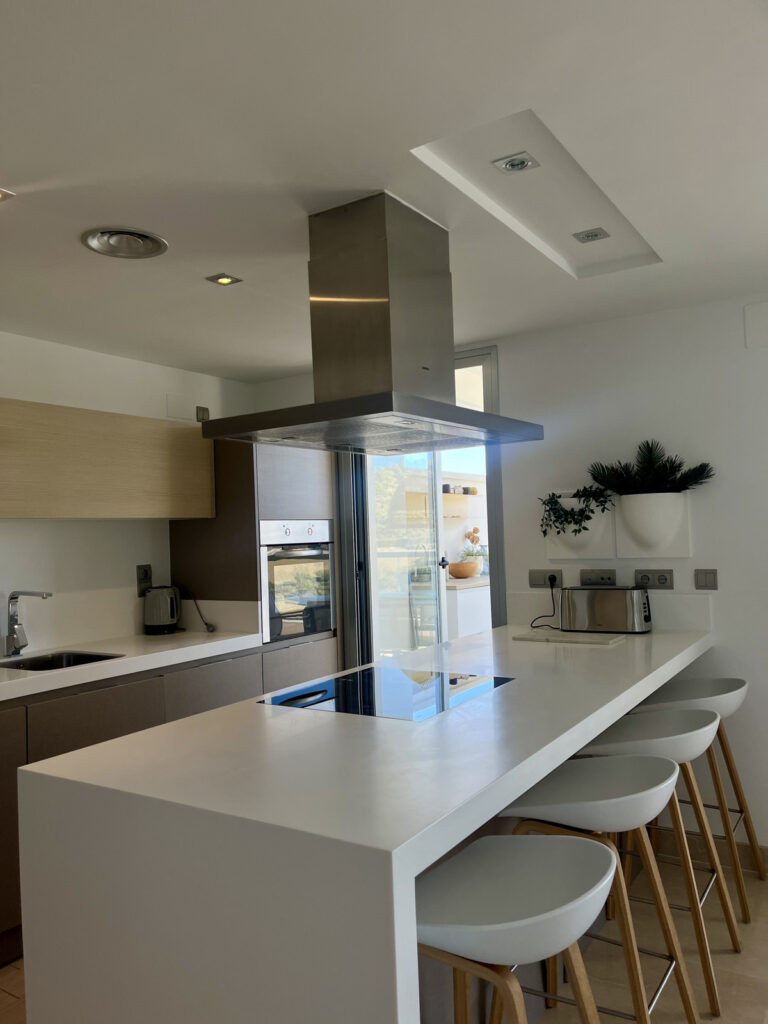 The home, with a built area of 101m²,and a terrace of 103m2 boasts an open and bright layout. The fully equipped kitchen is harmoniously integrated with the living room, creating an elegant common space ideal for leisure and socializing. High-end finishes include marble floors, built-in wardrobes, and an air conditioning system. The property is offered for sale in excellent condition. Additional features include high-speed internet access (Wi-Fi), Smart TV, elevator, and a private terrace overlooking the lush gardens and the heated communal pool, perfect for year-round enjoyment.