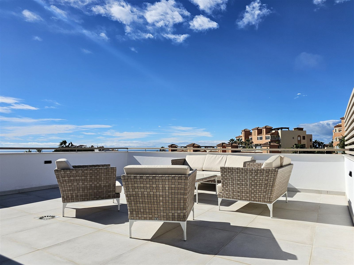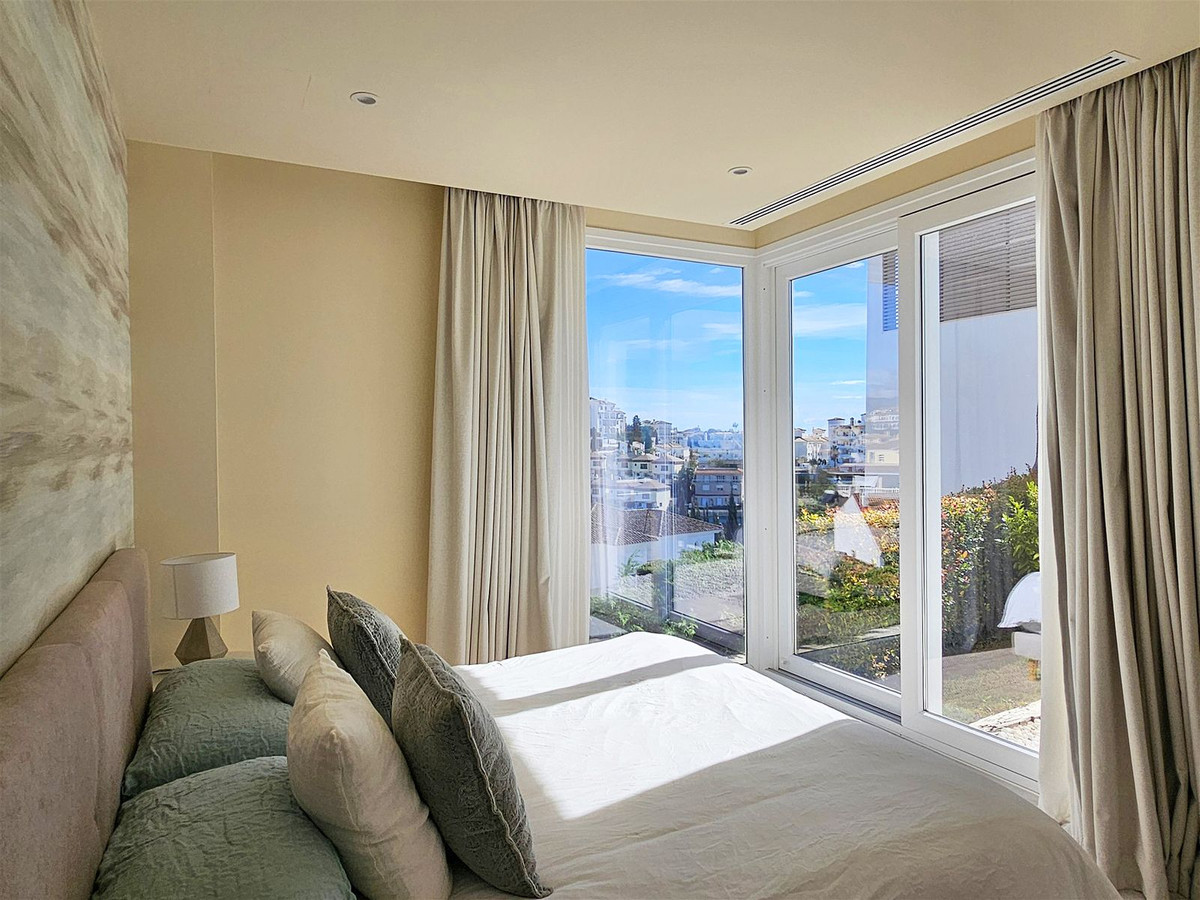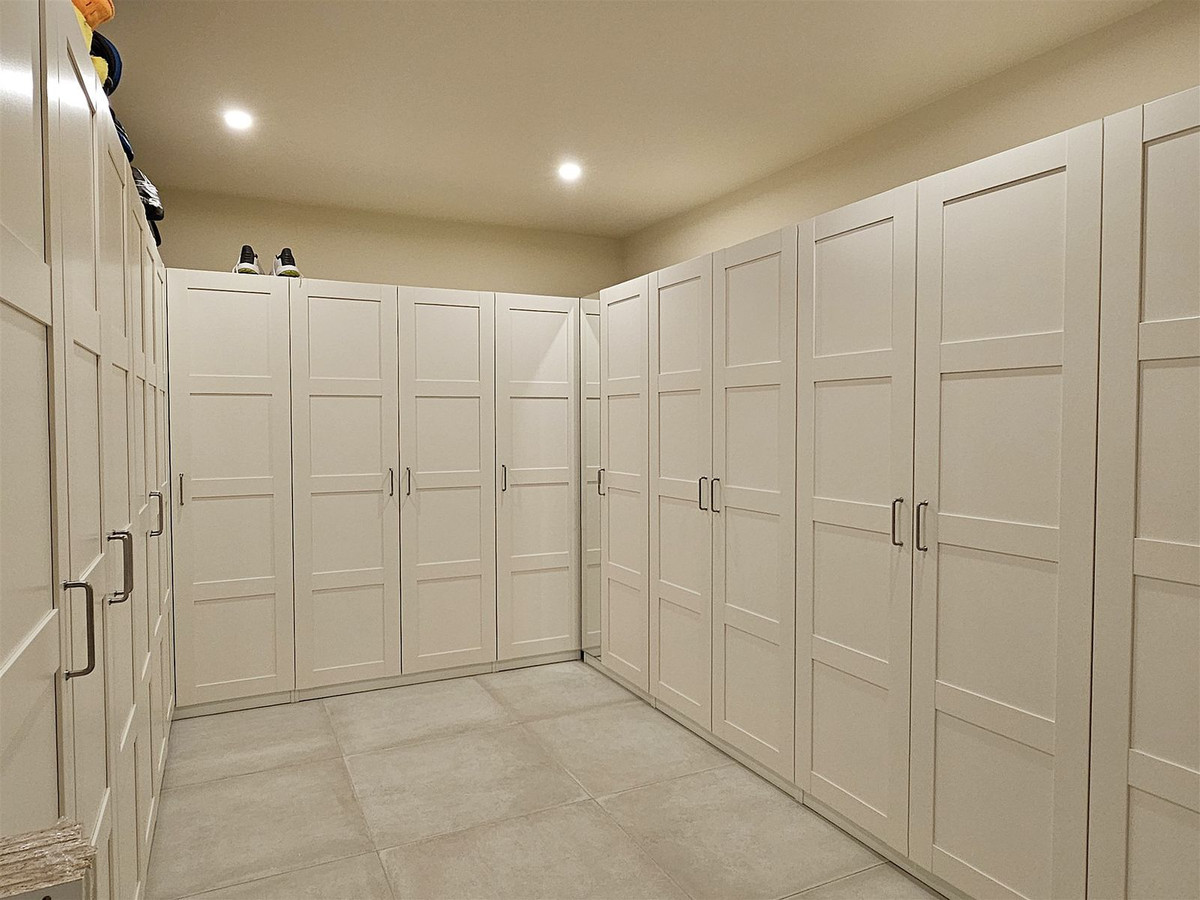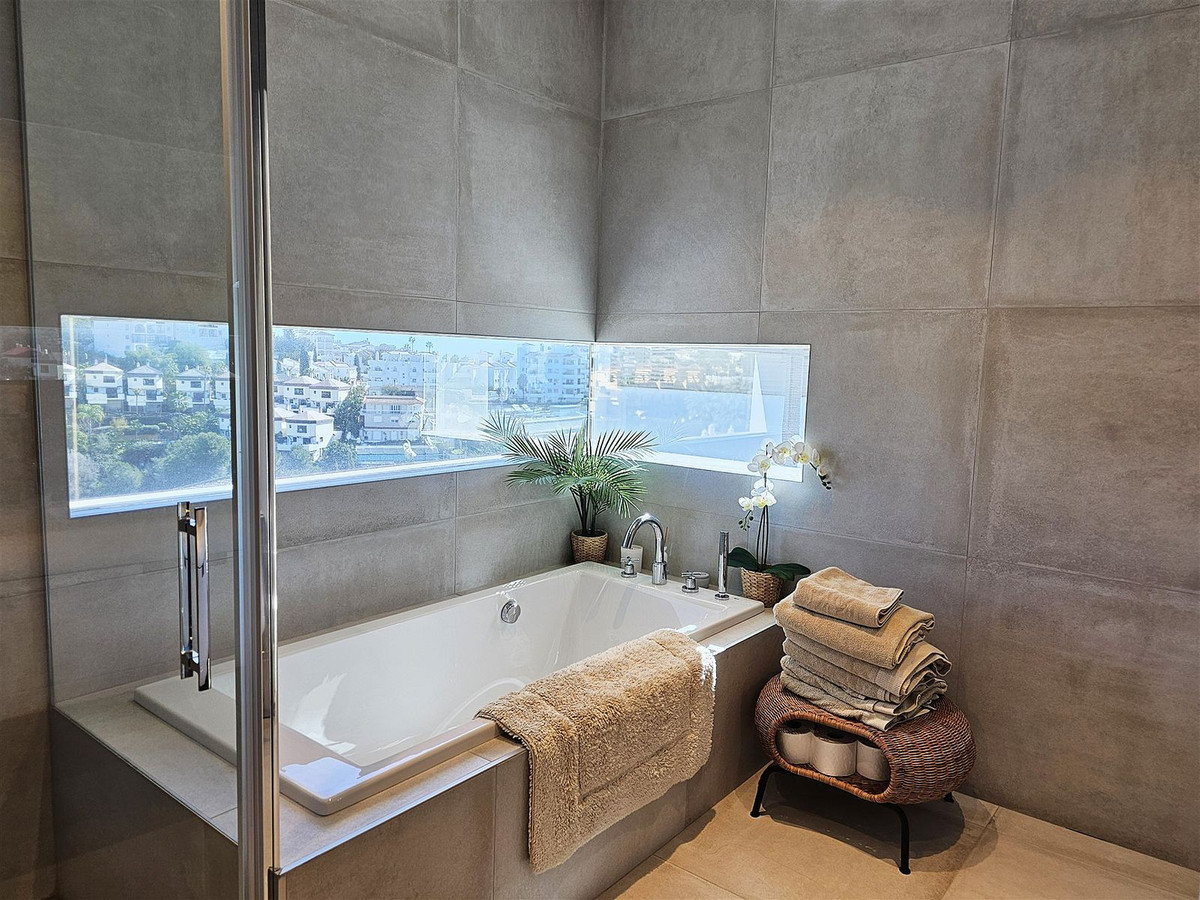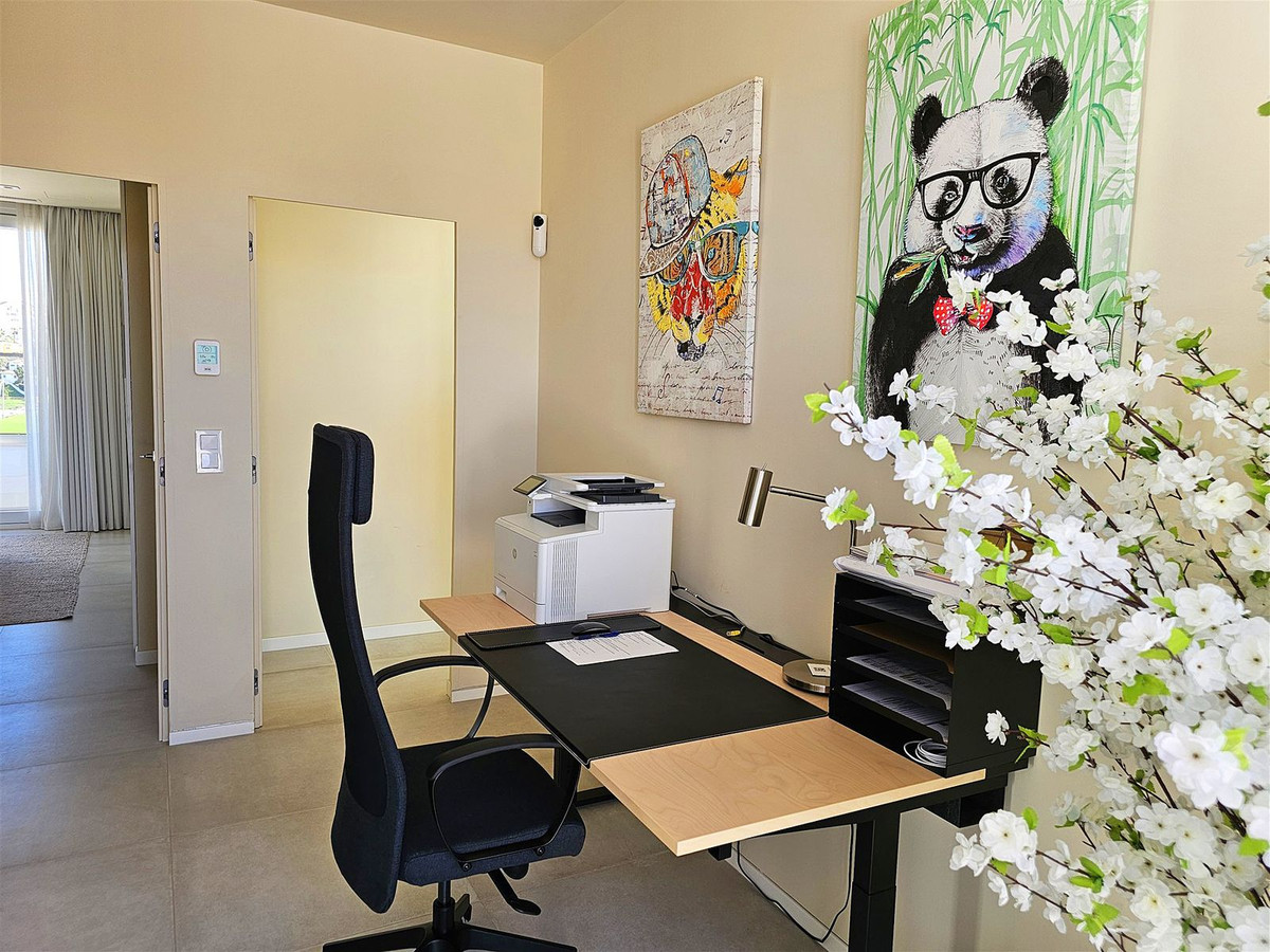 Upstairs, on the first floor, the landing is currently set up as a home office and leads out to a large 41 m2 terrace. Two further en-suite bedrooms are located on this floor, including the master suite, which enjoys particularly striking sea and golf views, a walk-in closet, and direct access to the terrace. The master bathroom features both a bathtub and separate shower.